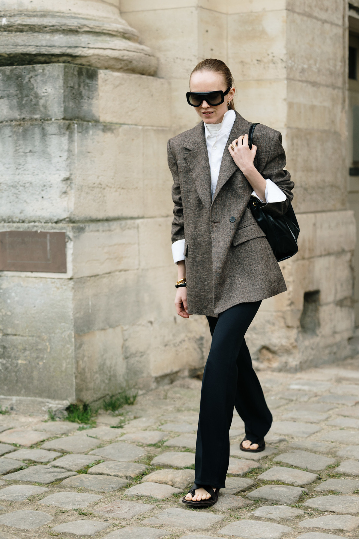 Брюки-балони, зокрема з манжетами, а також шаровари (аладіни) добре поєднуються з короткими приталеними жакетами або моделями без коміра. Як акцент додайте об’ємну сумку та мюлі на підборах.