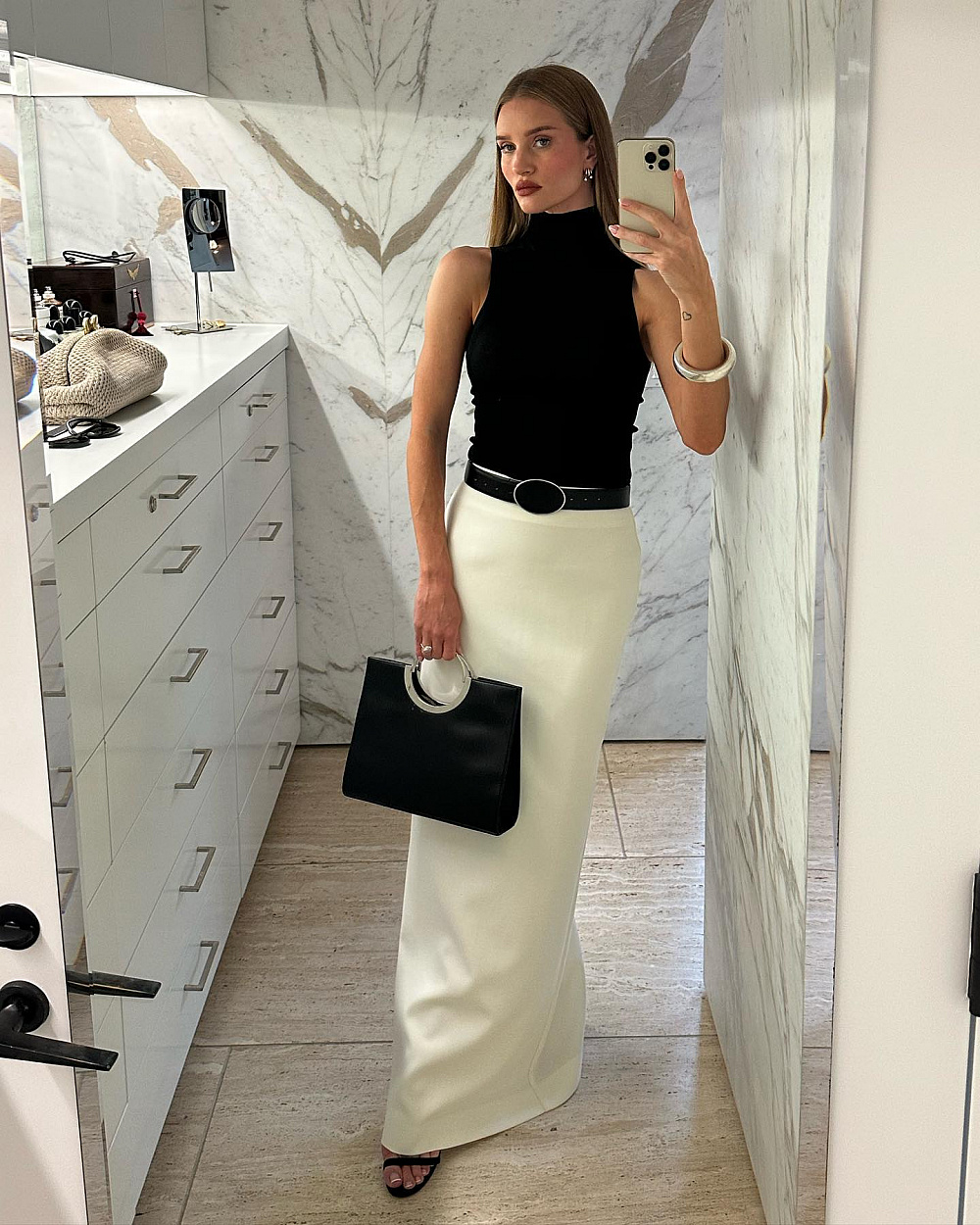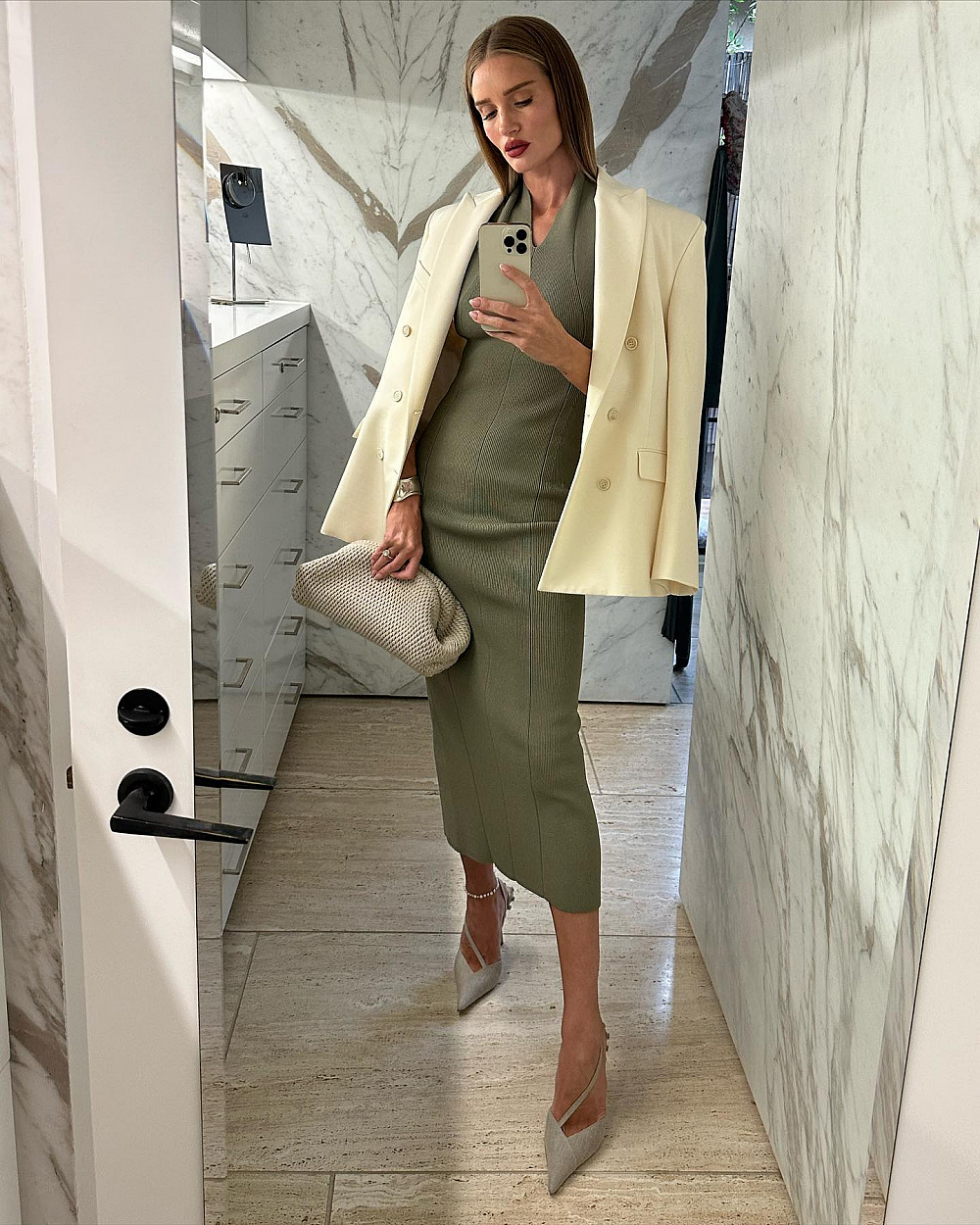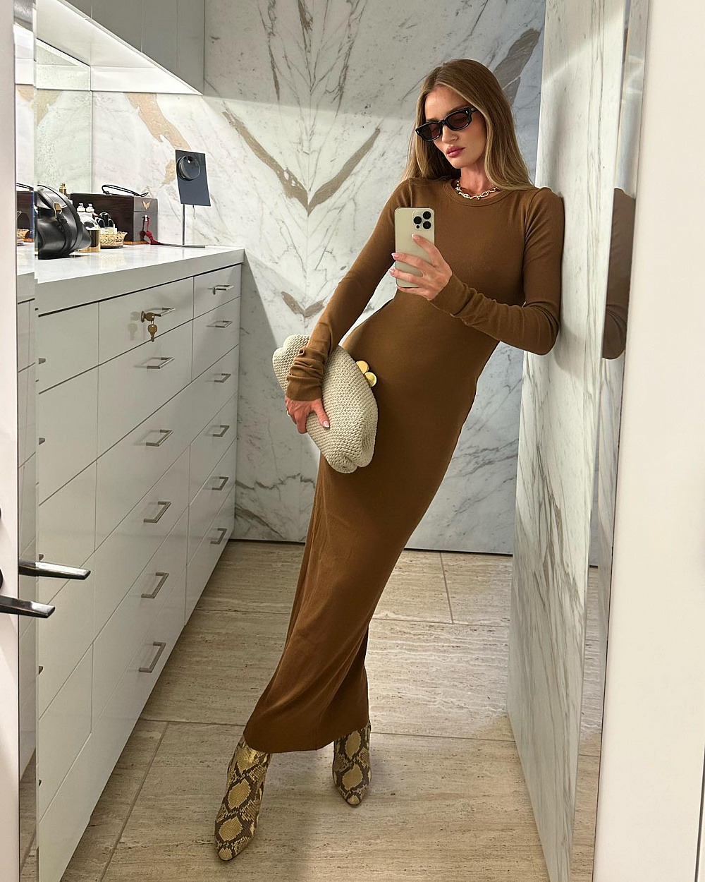 Трикотаж — це завжди про комфорт, а у випадку Роузі також і про стиль. Саме тому її гардероб часто також асоціюють з трикотажними сукнями довжини міді або максі. У її шафі дійсно знайдуться варіанти на будь-який смак: з різними фактурами, оздобленням, довжиною рукавів тощо.