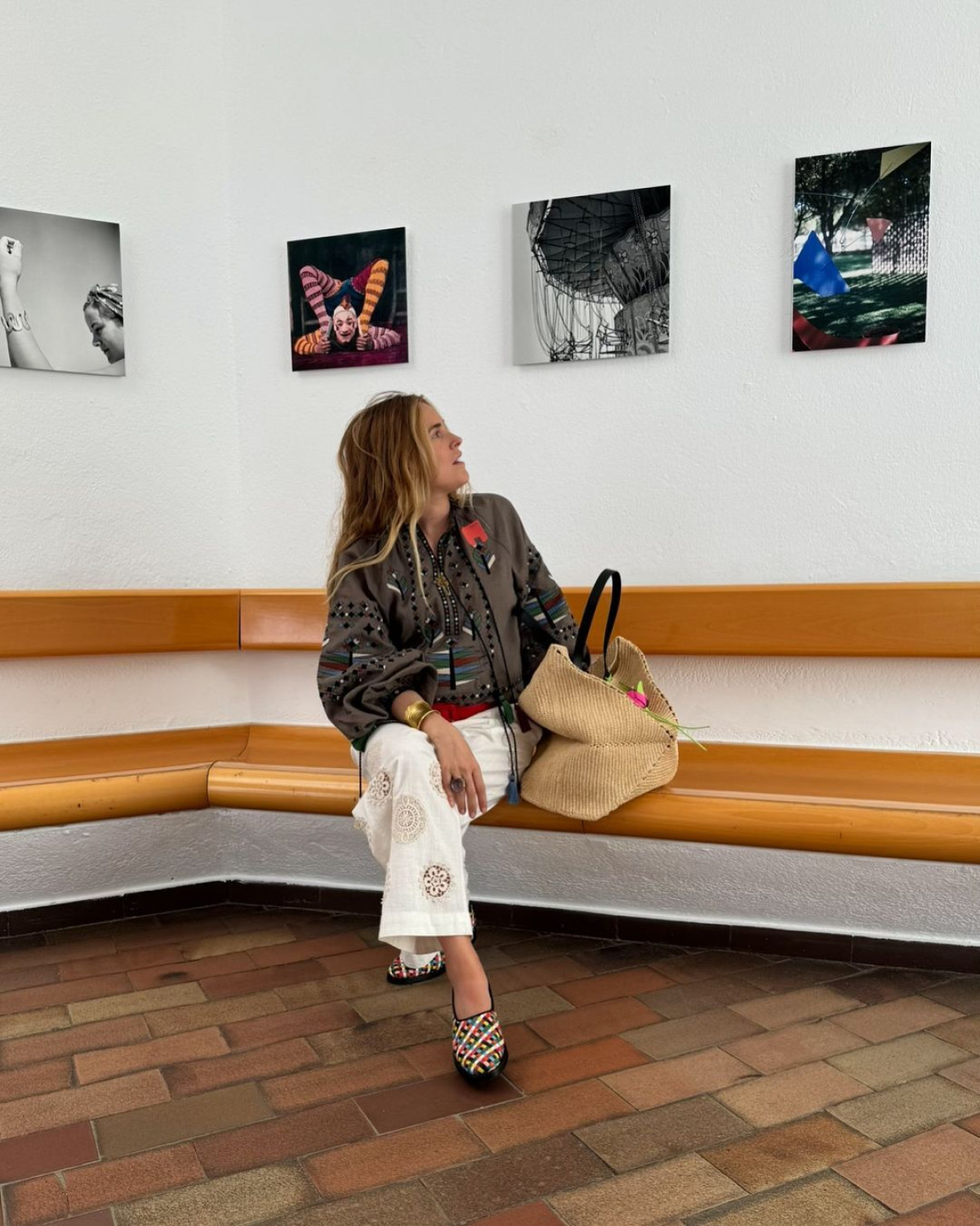 У блогерки Leandra можемо підглянути комбінацію вишитої сукні та брюк. Інфлюенсерка доповнила образ лляною мідісукнею Gloria з аплікацією та V-подібним вирізом, прямими джинсами, в’єтнамками та плетеною сумкою.