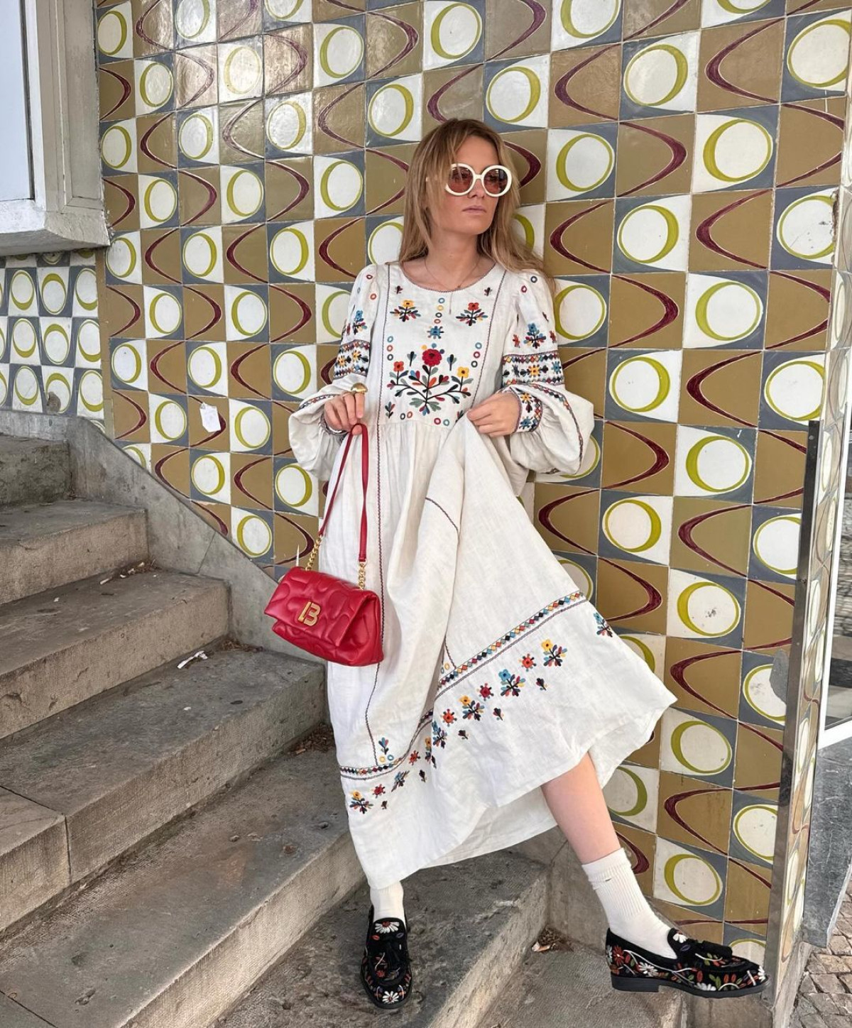 Натомість Carol Moralis продемонструвала модну стилізацію вишитої довгої сукні з яворівським орнаментом Yaryna. Блогерка довершила образ лоферами з візерунком, довгими шкарпетками й червоною сумкою.