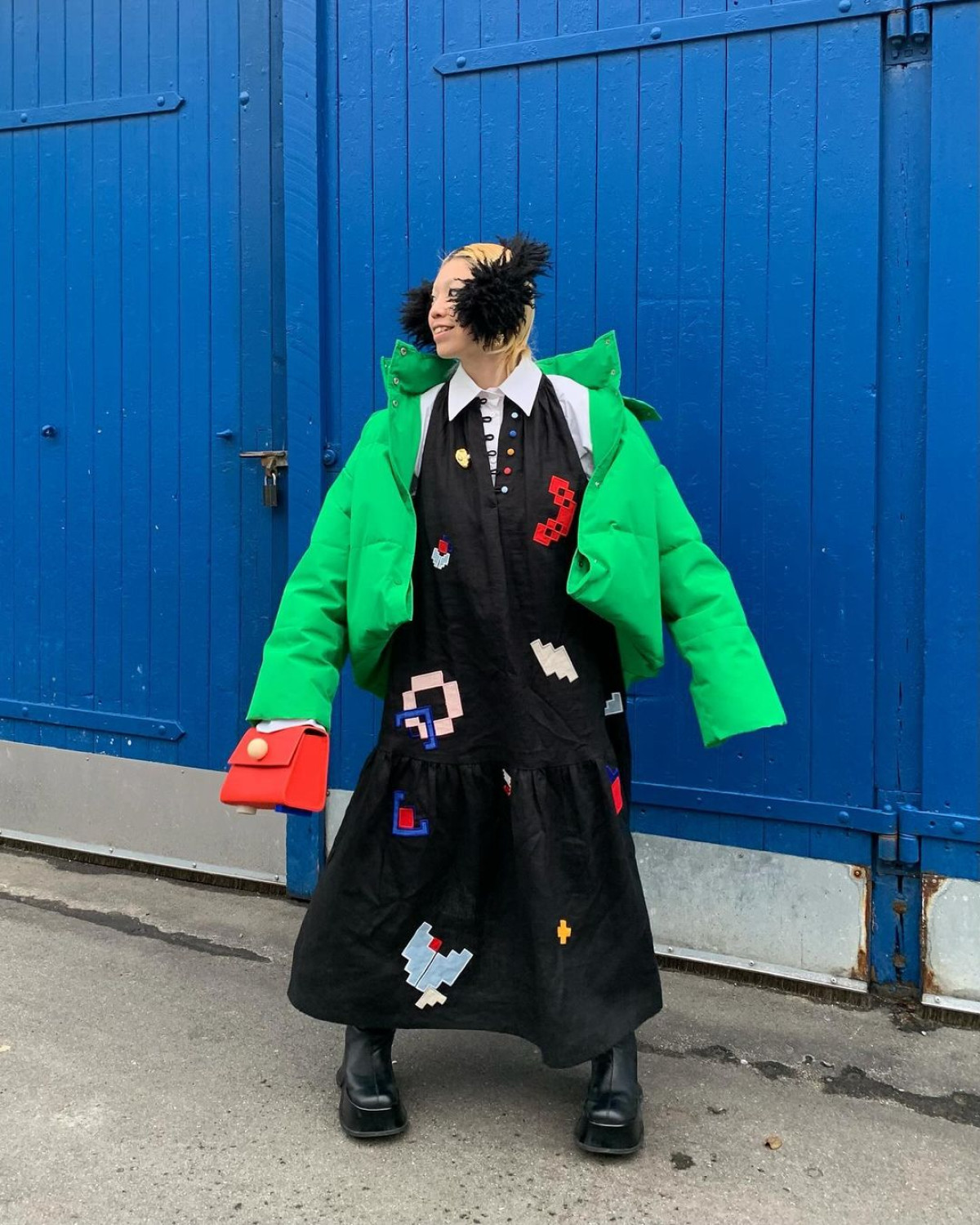 Інфлюенсерка Fumina Tabata також доповнила свій модний арсенал вишитою сукнею. Вона обрала лляний сарафан з аплікацією Eva Summer у чорному відтінку, який скомбінувала з білою сорочкою, яскравим зеленим пуховиком, червоною сумкою і чорними чоботами.