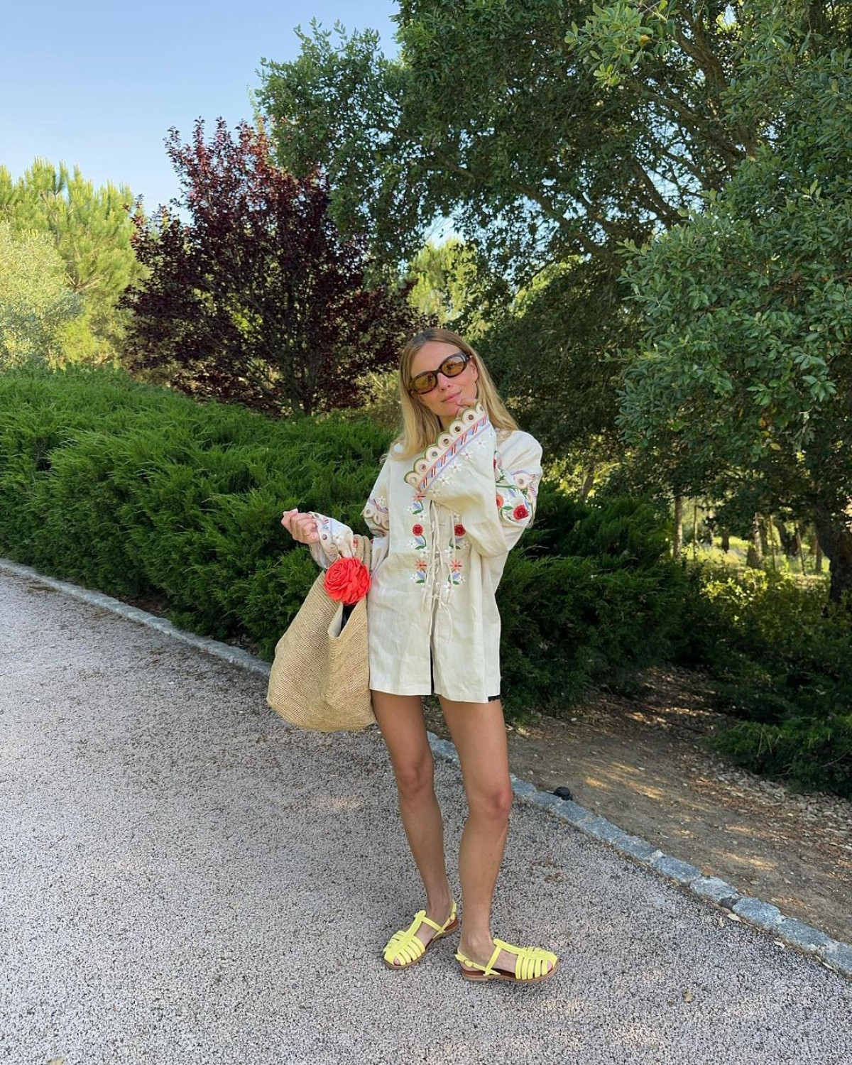 Ще один літній образ продемонструвала Mafalda Patricio. Блогерка зупинилася на вишитій блузі Abrykosy W, присвяченій Українському Сходу, яку стилізувала з короткими шортами, лимонними рибацькими сандалями, плетеною сумкою та окулярами з коричневими лінзами.