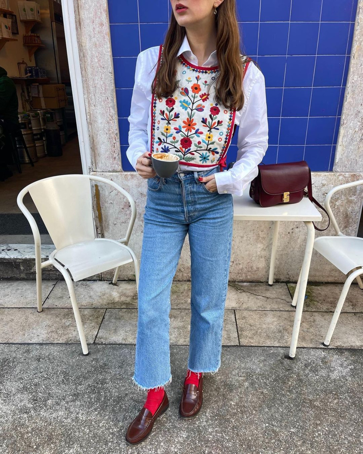 Паризька модна блогерка Marielle Haon показала стильний образ із базовими джинсами. Вона поєднала лляний жилет із зав`язками Yaryna zhylet, доповнений яворівським орнаментом, штани, білу сорочку та коричневі лофери. Яскравим акцентом стали червоні довгі шкарпетки.