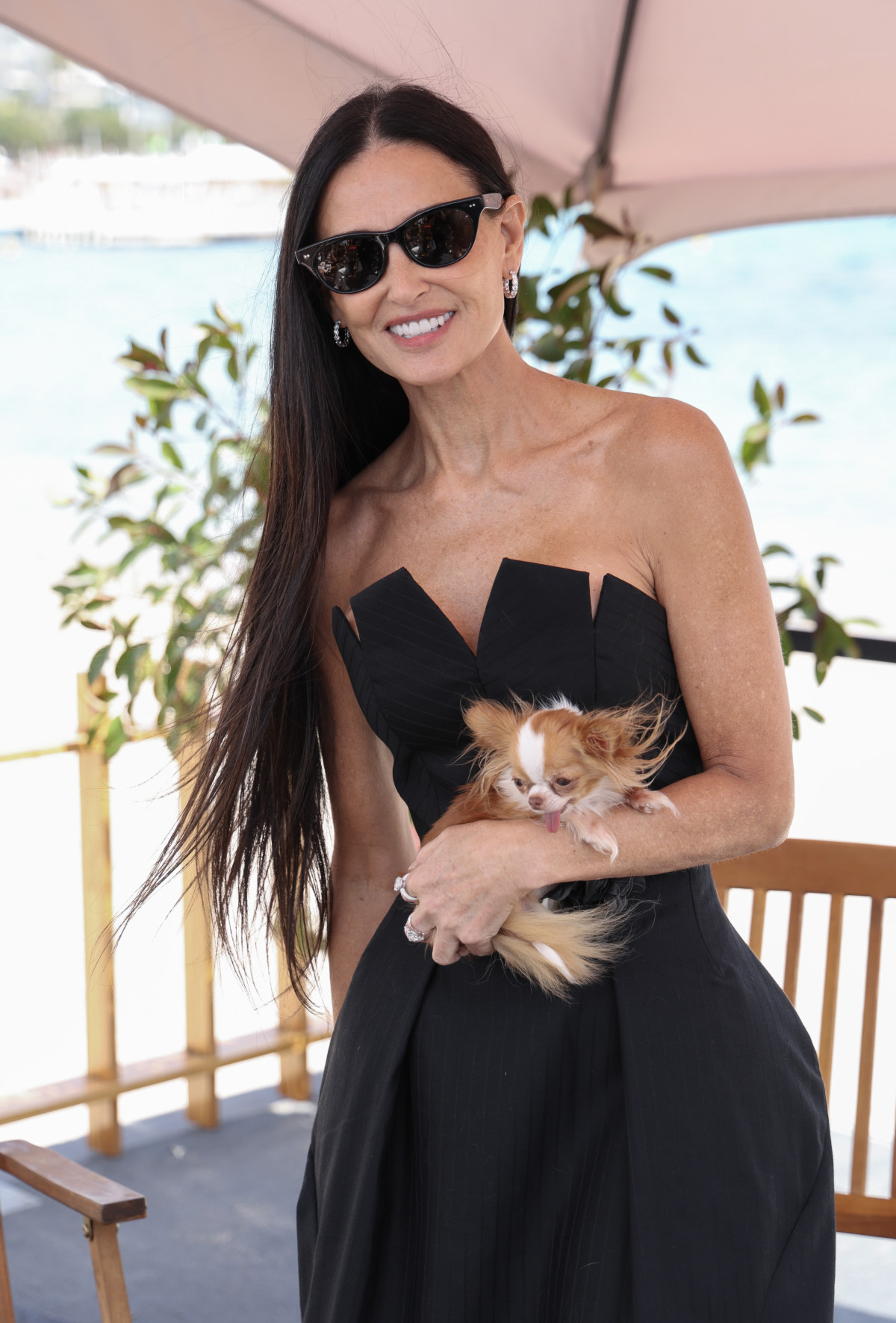 Не менш цікавими вийшли й денні виходи зірки в Каннах. Спочатку акторка зупинилася на лаконічній чорній сукні максі без бретелей, а в інший день обрала принт у горошок. Під час кожної з цих появ Демі Мур тримала в руках свого собачку — чихуахуа на ім’я Пілаф.