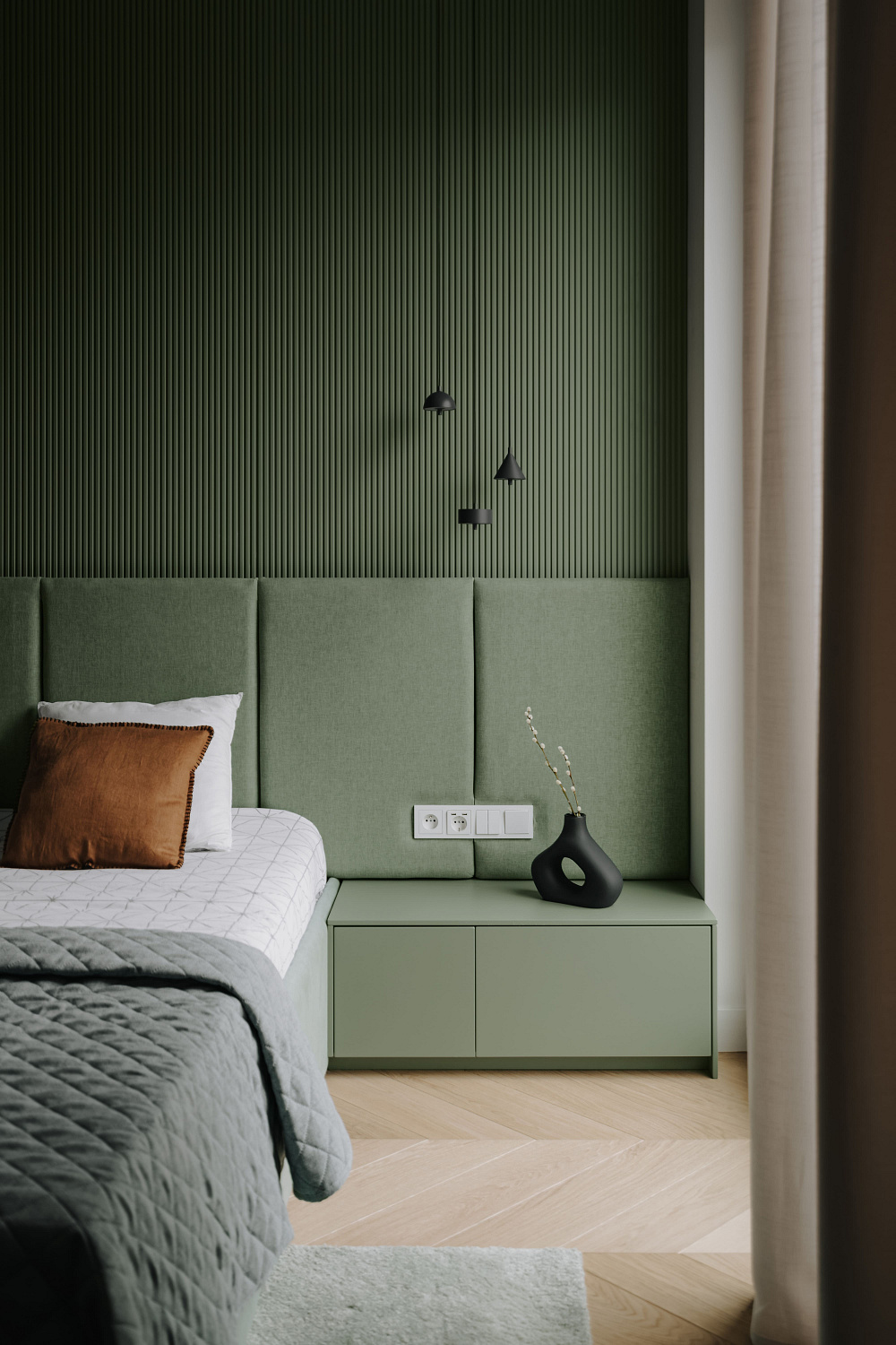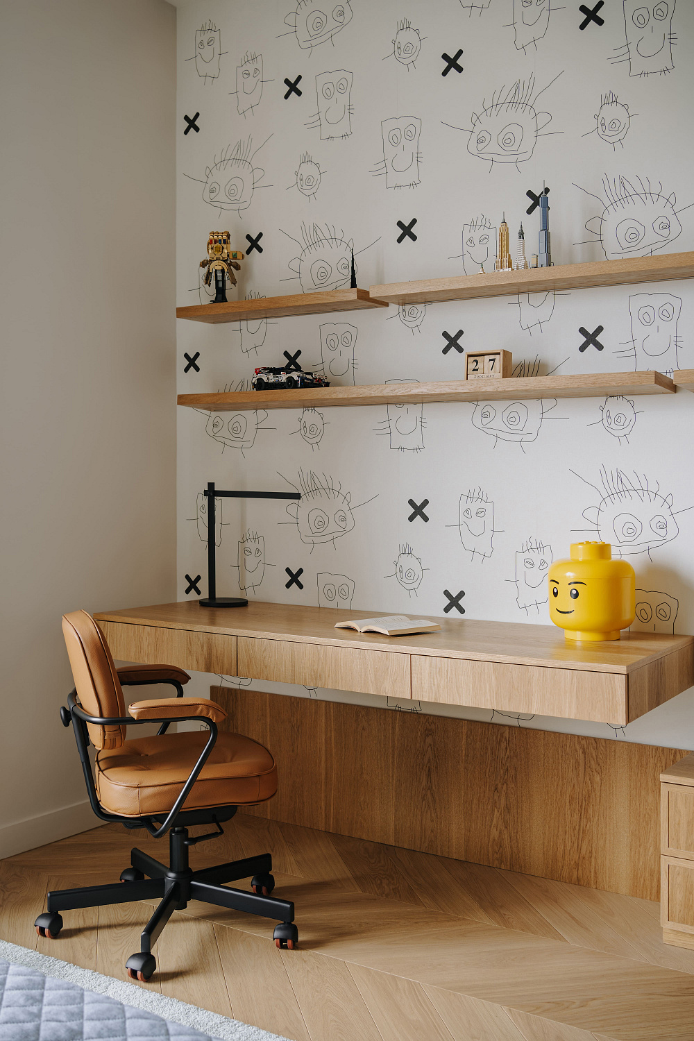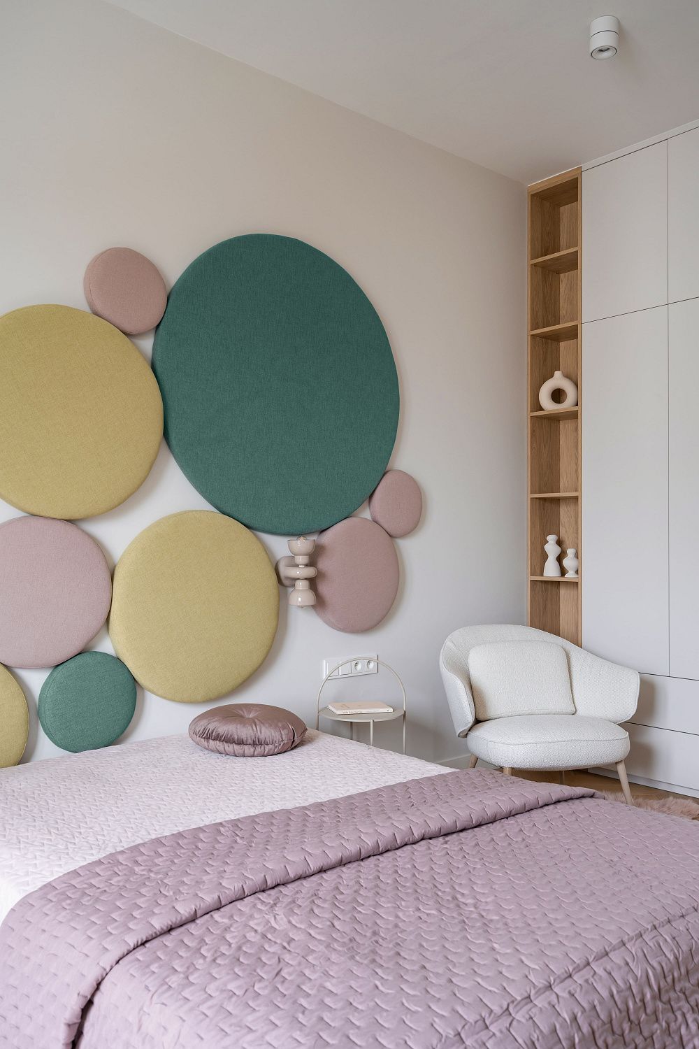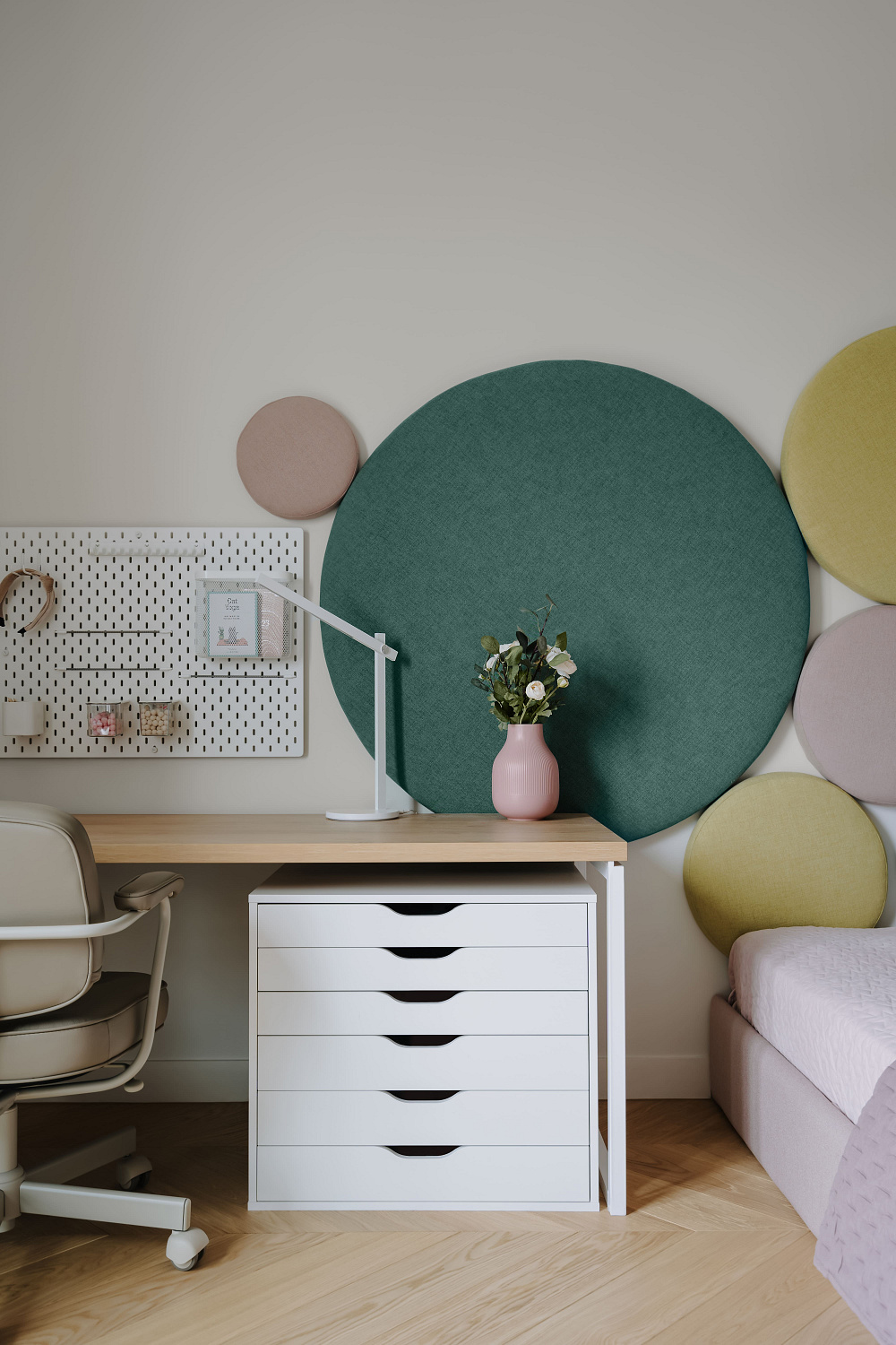 Інтер’єр обох дитячих кімнат дуже практичний, адже приміщення не мають чіткої прив’язки до віку дітей. Якщо кімната дівчинки ще відзначається певними атрибутами, що вказують на її вік (декоративне підголів’я на стіні у вигляді м’яких кругів пастельних відтінків), то кімната хлопця у приглушених смарагдових тонах є абсолютно універсальною. Наповнені іграшками, обидві кімнати виглядають дитячими, а з більш загальним декором будуть уже домівкою для підлітків, без потреби в редизайні.