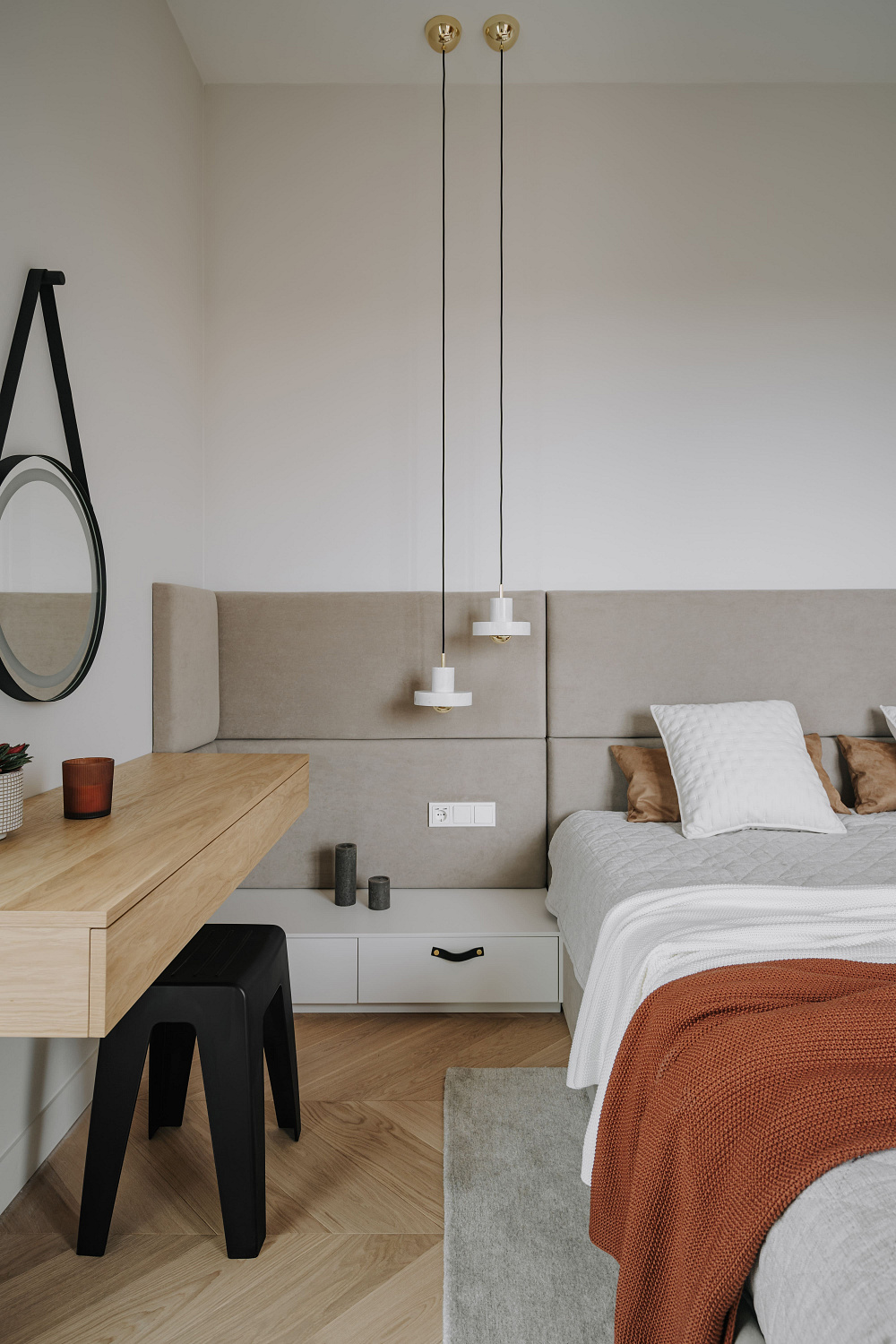 Згодом подружжя запросило українське бюро продовжити співпрацю над інтер’єром своєї нової квартири вже в Польщі. Це виявилася світла трикімнатна оселя на третьому поверсі новобудови в сучасному районі міста. Замовники обрали простір, що задовольняв усі їхні потреби: дві дитячі кімнати, батьківська спальня з окремим санвузлом, гардероб і простора кухня, сполучена з вітальнею.