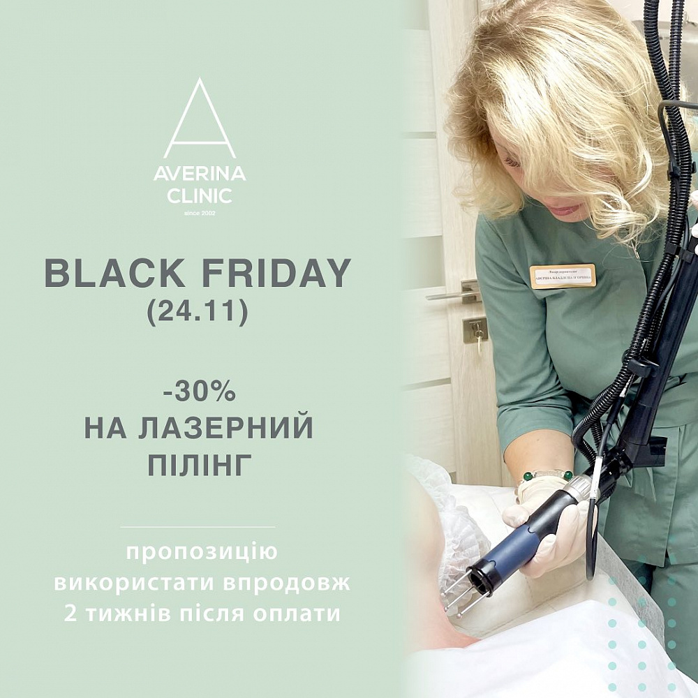 У клініці Аverina Сlinic з нагоди Black Friday дарують знижку -30% на лазерний пілінг. Це апаратна процедура інтенсивного відлущування та шліфування шкіри, яка забезпечить вам здоровий колір обличчя, стягне пори, прибере дрібні зморшки та пігментні плями. Акція діє протягом двох тижнів від дня оплати (оплата лише 24.11). Також діє акційна пропозиція Black Friday -20% на всю доглядову косметику з полиць Аverina Сlinic.