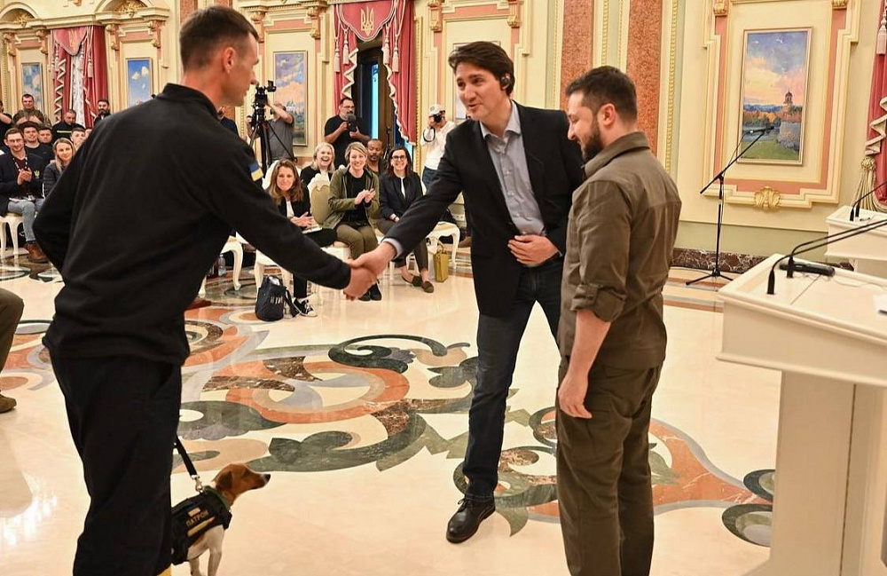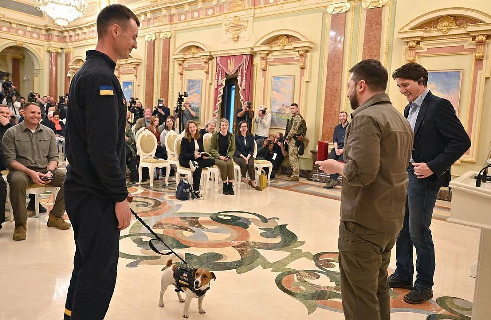 «У присутності пана прем`єр-міністра Канади Джастіна Трюдо нагородив сьогодні наших саперів, зокрема й малого, але дуже відомого сапера Патрона. Собаку, який допомагає очищенню нашої землі від слідів окупантів. І який допомагає також вчити дітей протимінної безпеки. Через російських загарбників це тепер одне з найбільш актуальних завдань — навчити дітей розпізнавати вибухонебезпечні предмети та уникати їх. Ось таке “звільнення” від безпечного життя для українських дітей Росія принесла в Україну», — сказав Володимир Зеленський.