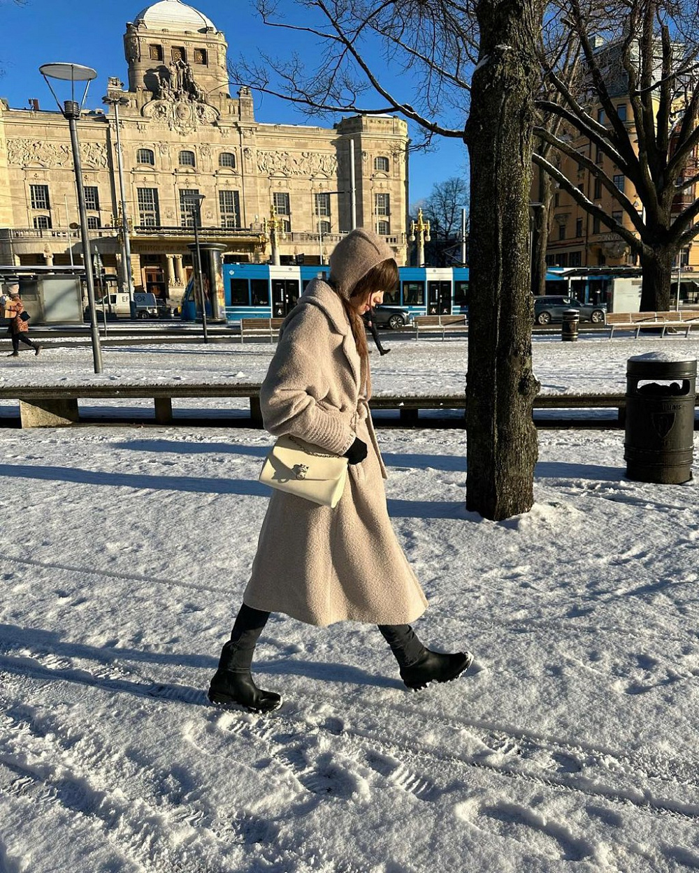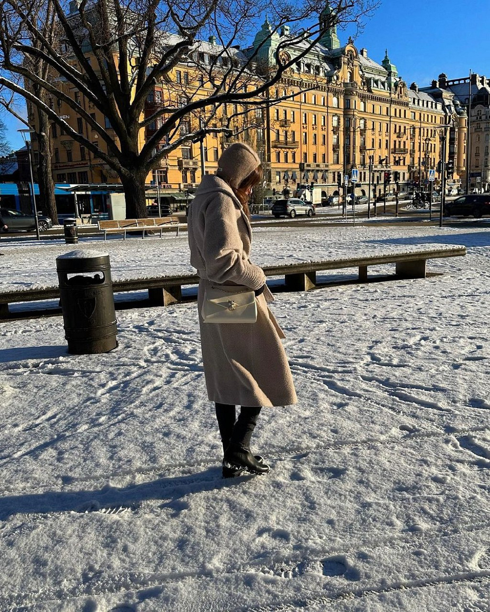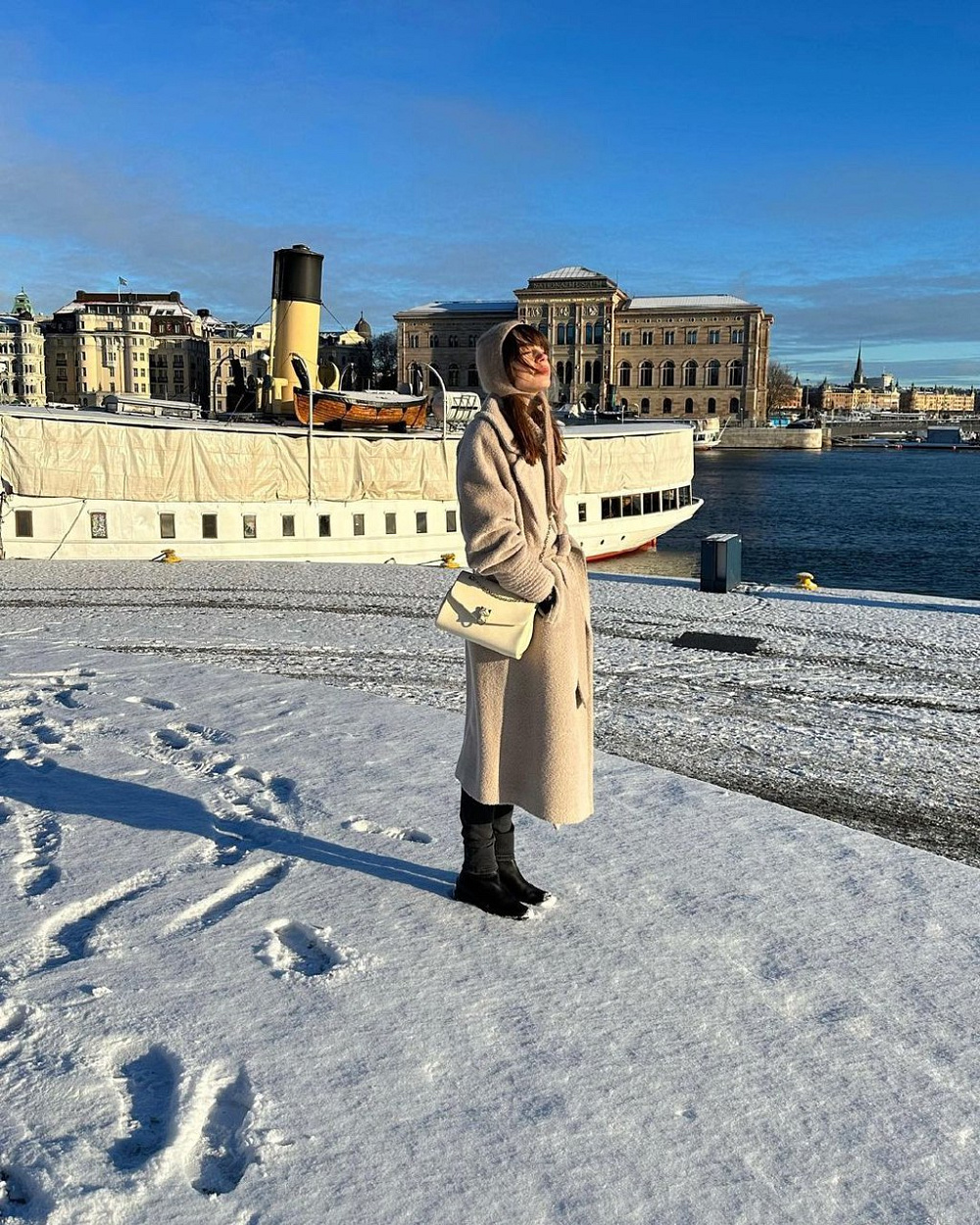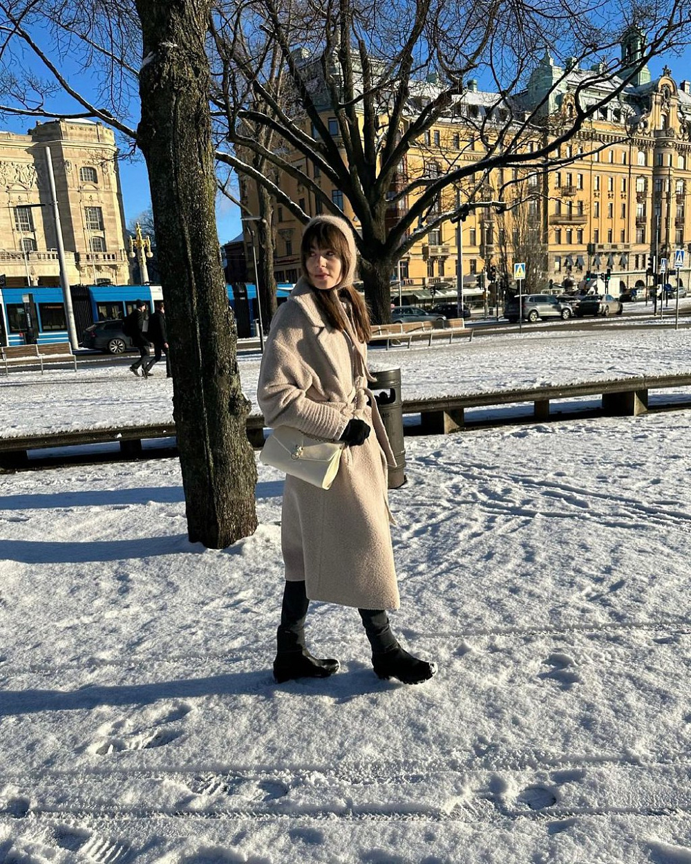 Акторка ідеально втілила шведський лагом у своєму образі — збалансованому та затишному, доповненому в’язаною шапочкою від українського бренду GUNIA Project і сумкою Cartier.