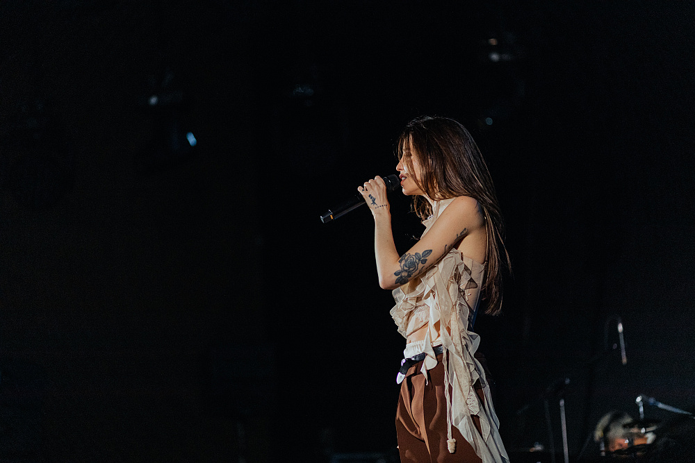DOROFEEVA: Цей образ — робота стилістки Тані Немченко для кліпу з Максом Барських на пісню «Ритми». Я подумала, що було б цікаво показати в турі й таку мене, такий настрій. Тут є елементи від українського бренду Katimo, завдяки яким костюм вийшов стильний та актуальний.