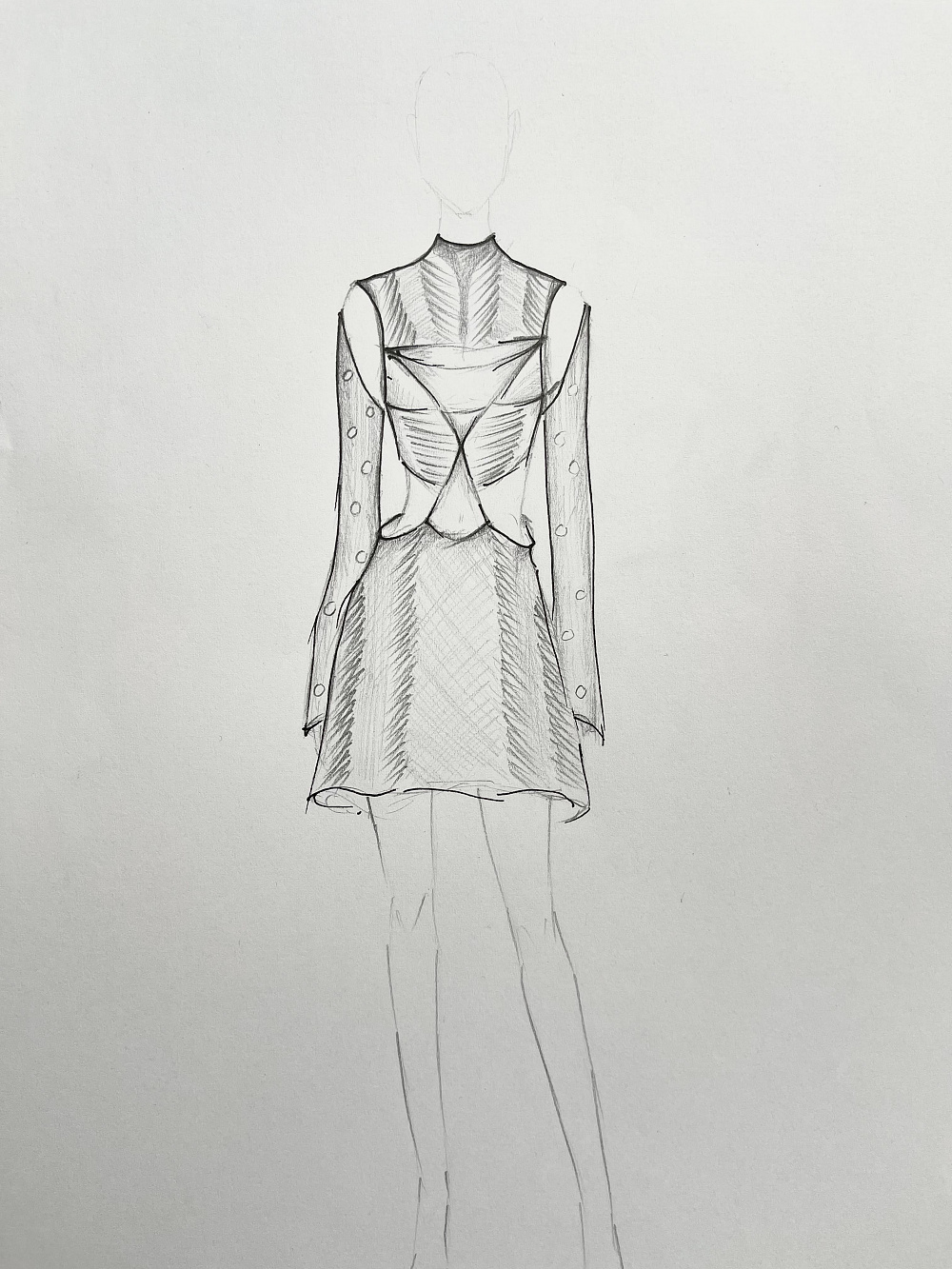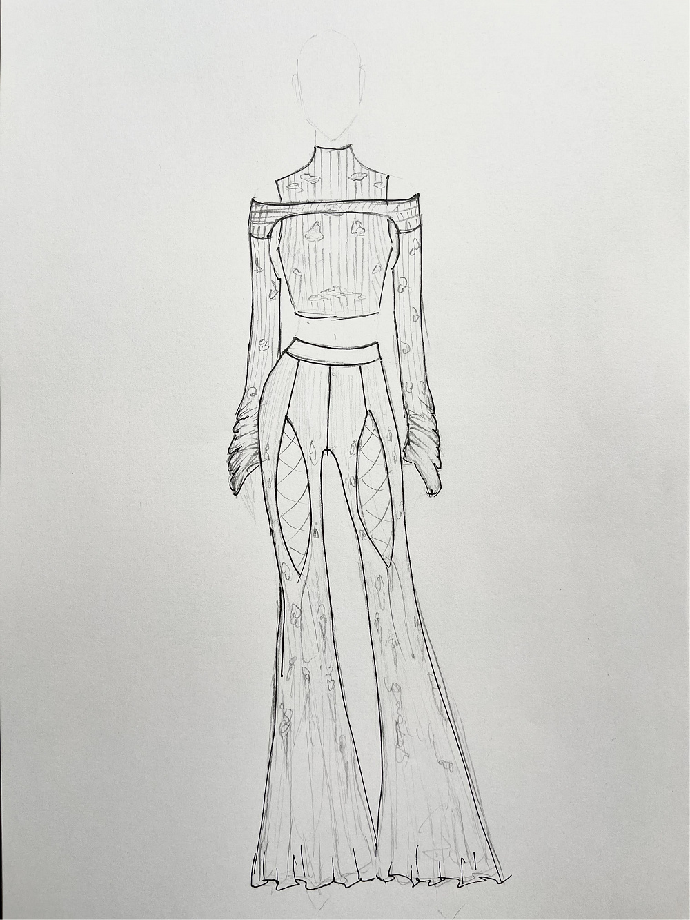 Чорна сукня для Наді була зв’язана з льону в єдиному екземплярі. Це повністю ручна робота. Оскільки мене надихають різновидні павуки, метелики та змії, в моїх роботах проявляється анімалістичний стиль. Якщо придивитись на їхні яскраві забарвлення, можна побачити та уявити собі різні візерунки, деталі для своїх виробів. На створення цієї сукні мене надихнуло павутиння, тому я вирішила зробити таку «павутинну сукню».