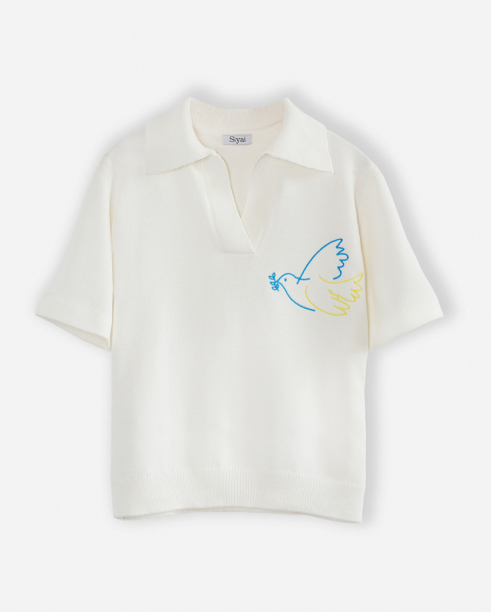 Український бренд трикотажу Siyai славився насиченою палітрою кольорів і в довоєнні часи, однак сьогодні в арсеналі бренду з`явилося чимало жовто-блакитних речей. Поло із ніжним зображенням голуба та смугастий светр у національних кольорах.