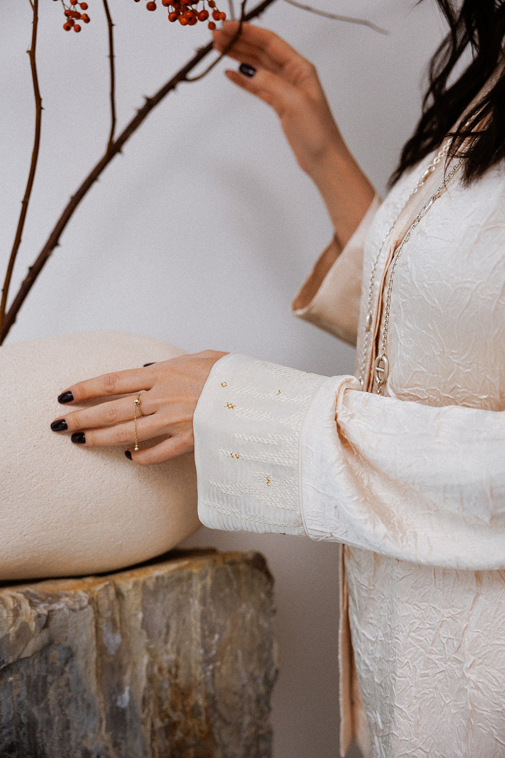 Стилістка долучилася до роботи над проєктом в якості керівника креативної команди. Кожен елемент костюму, оздоблення та орнамент для вишивки — результат багатогодинної комунікації між Олею та департаментом розробки продуктів бренду.