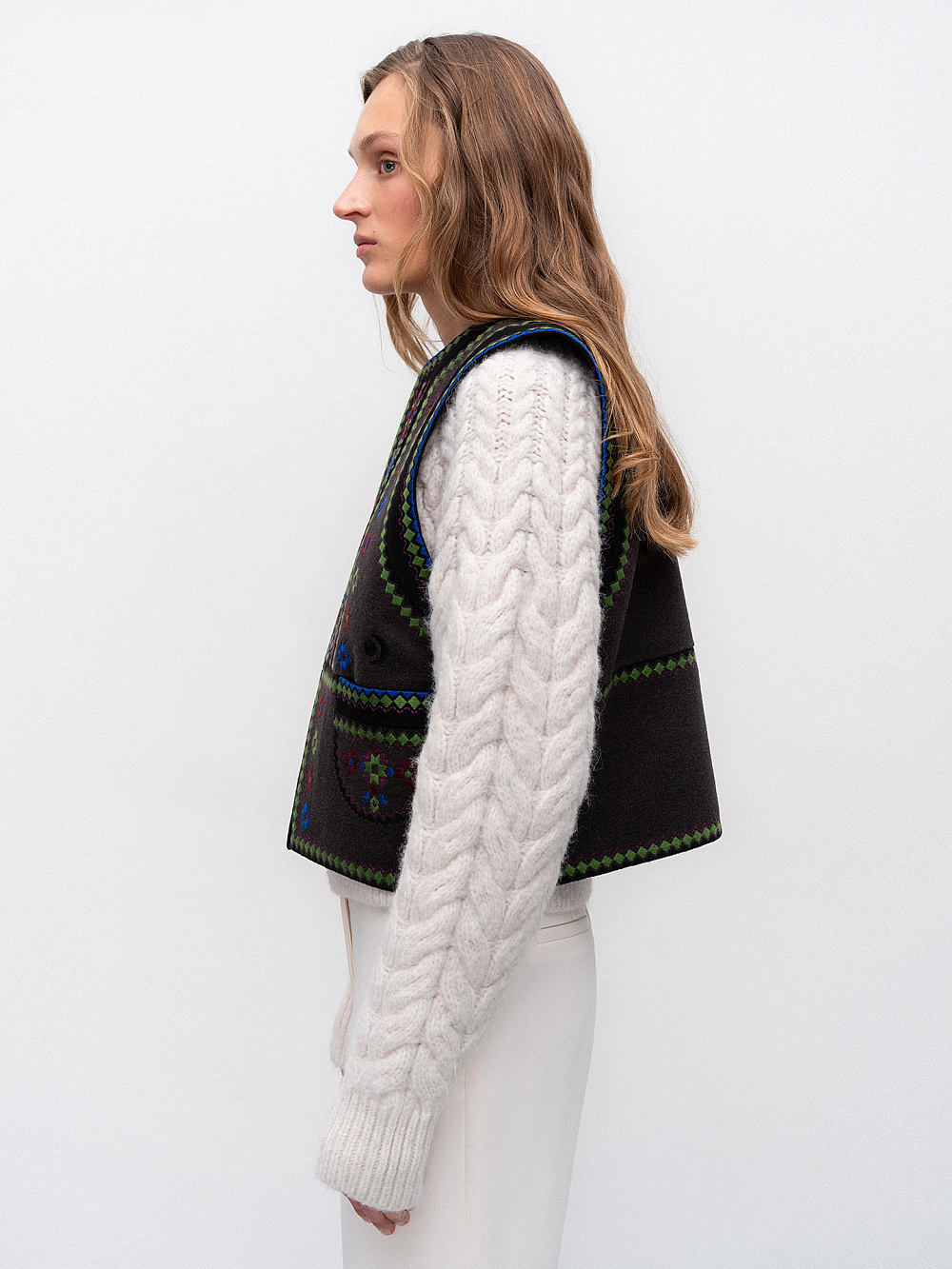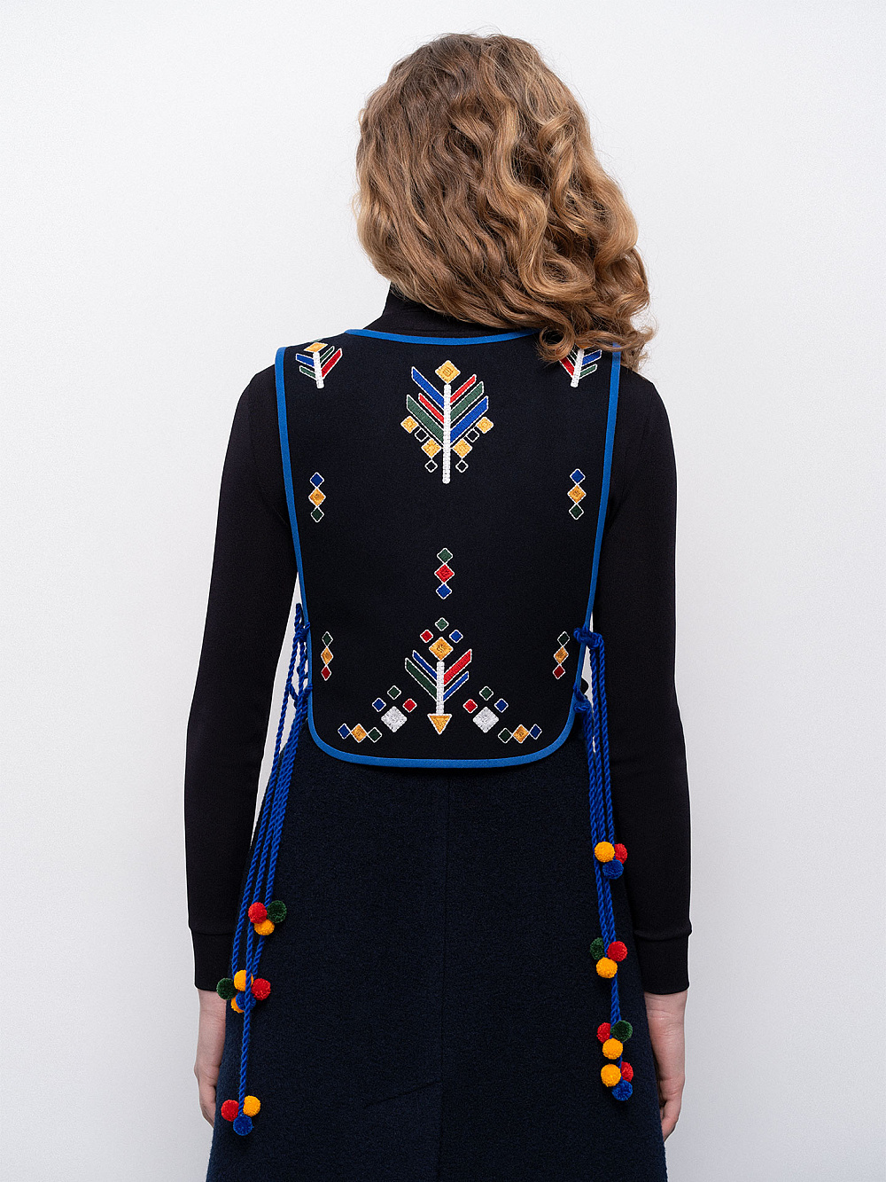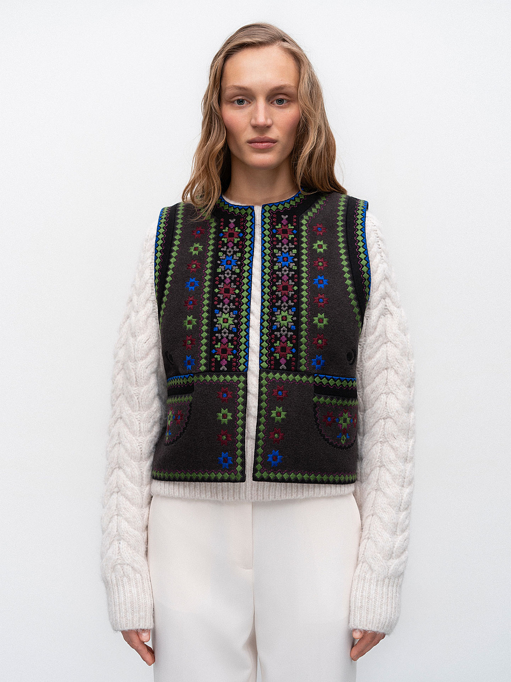 Жилетка створена з вовняної пальтової тканини та оздоблена вишивкою з акрилової нитки. Орнамент натхнений різдвяною зіркою — традиційним атрибутом різдвяного обряду колядування.