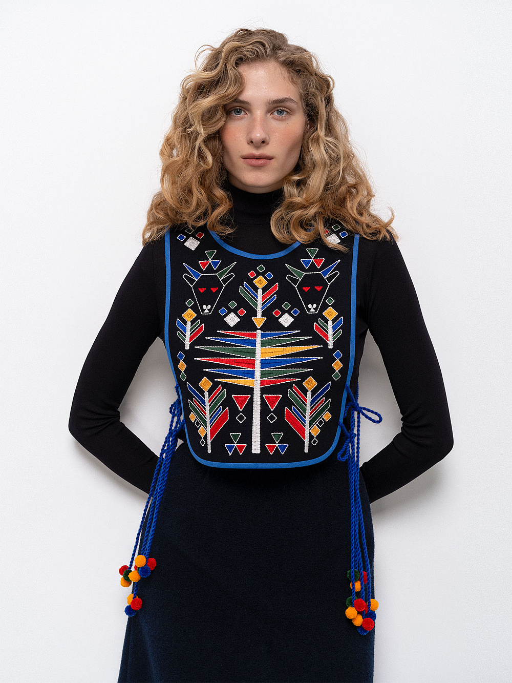 Накидка зі шнурами-зав’язками збоку на талії, створена з вовняної пальтової тканини з лляною підкладкою. Краї виробу оздоблені контрастною лляною стрічкою. Орнамент натхнений однією з найдавніших різдвяних містерій — водінням кози. Коза — одна з головних персонажок ритуальної різдвяної вистави.