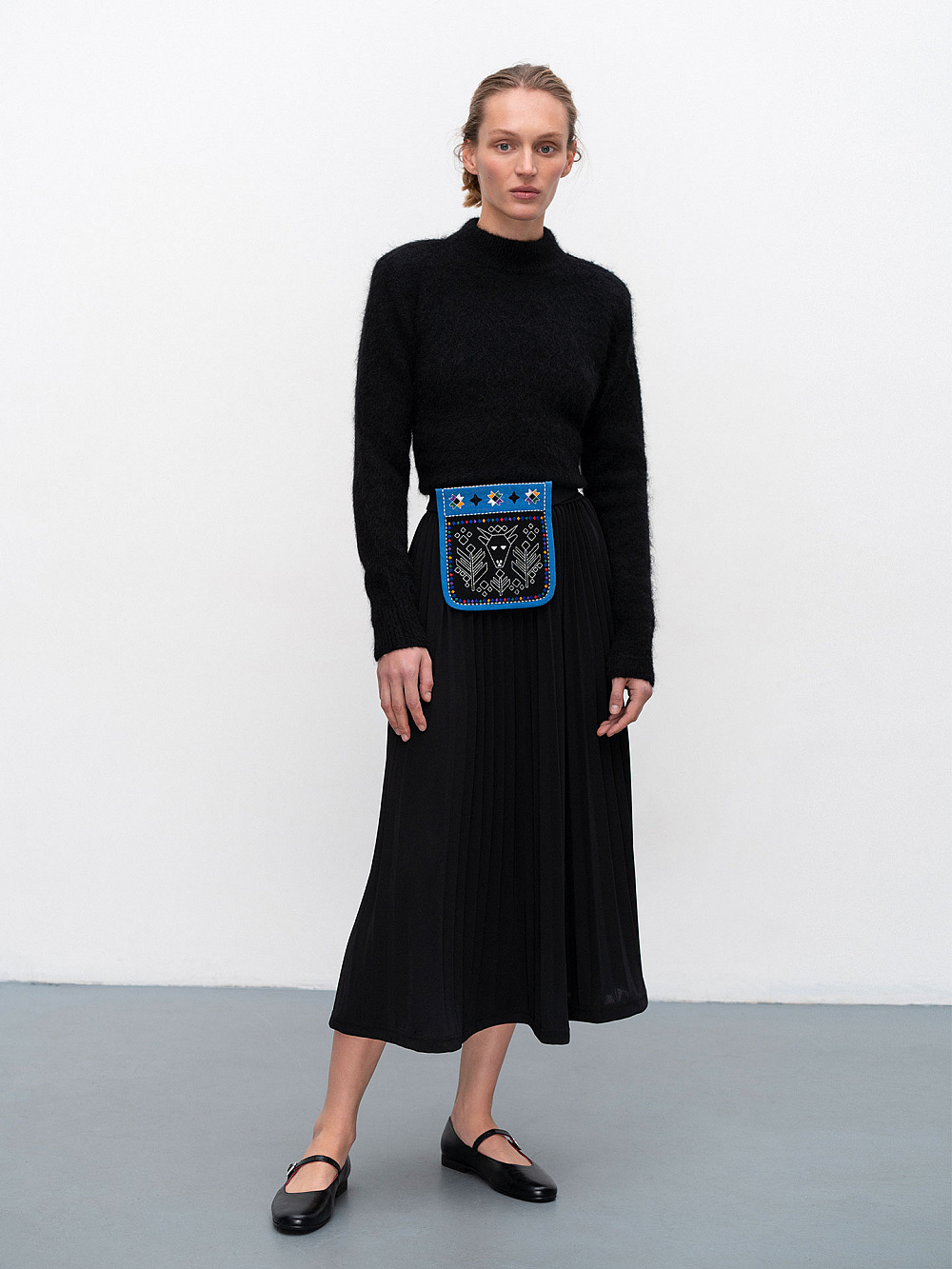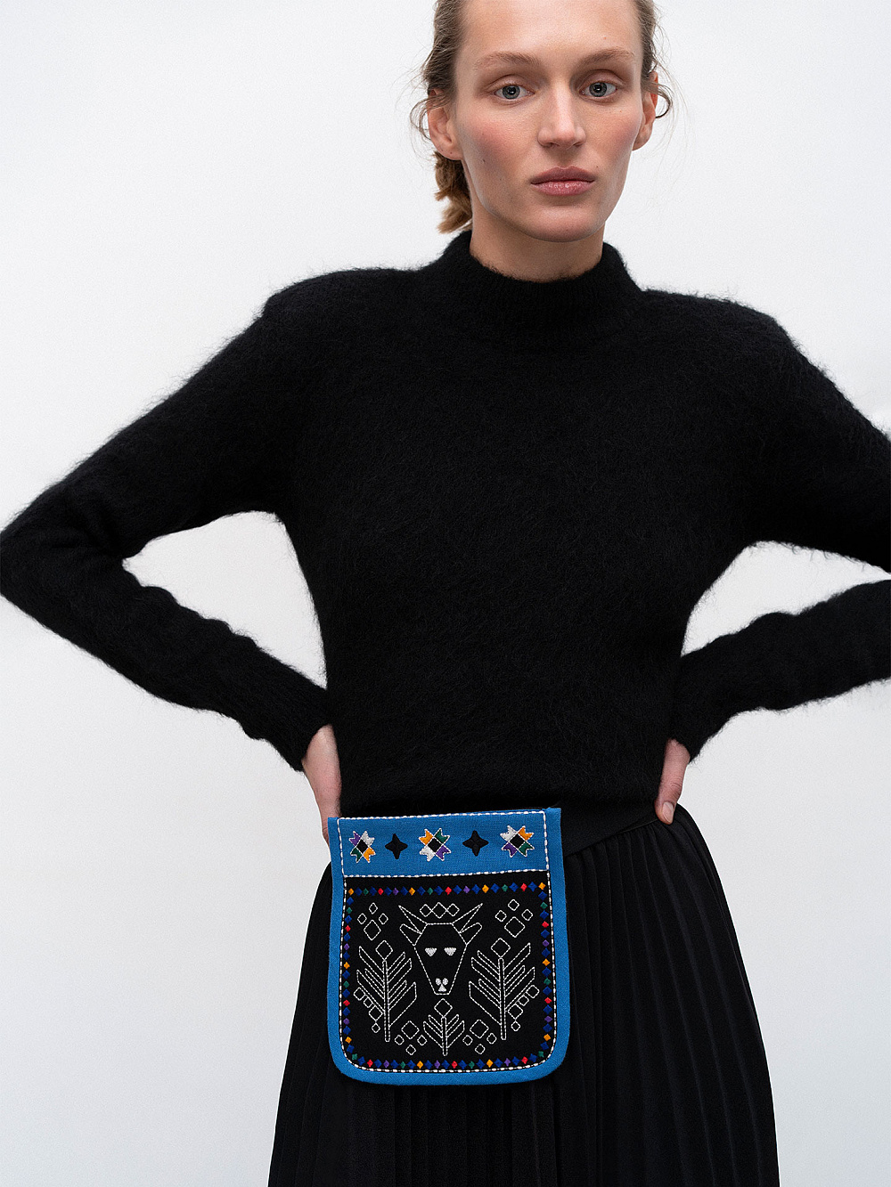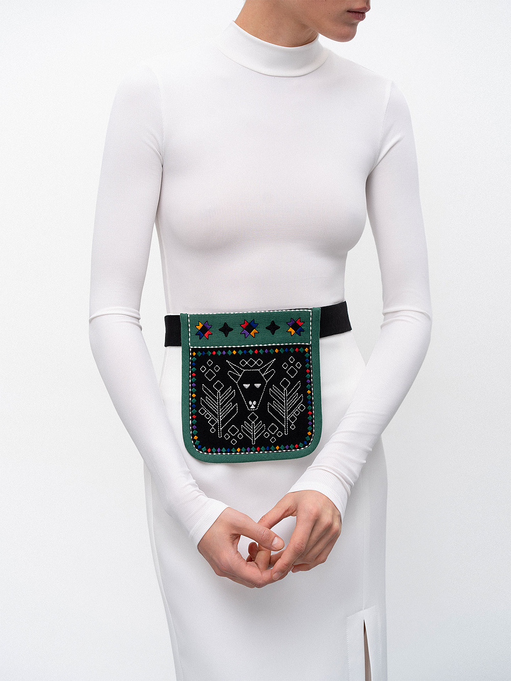 Сумка-кишенька з пальтової вовняної тканини з лляною підкладкою та поясом, оздоблена контрастною лляною стрічкою. Орнамент натхнений містерією водіння кози.