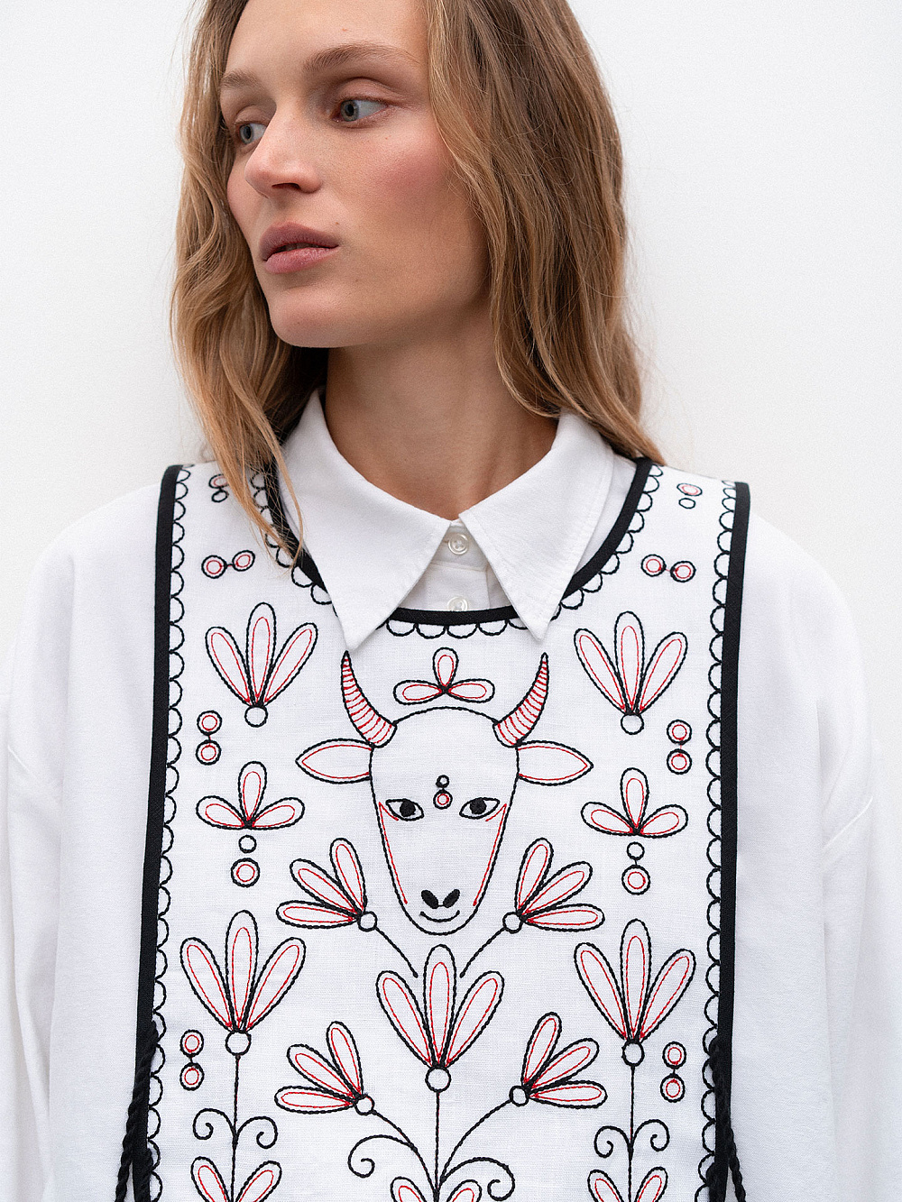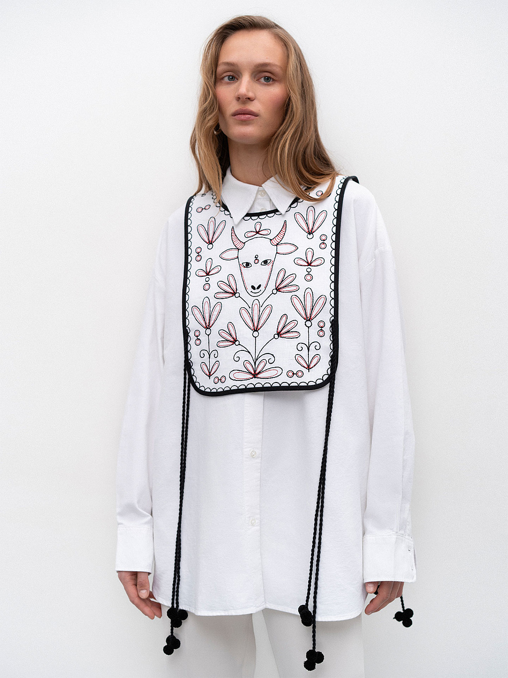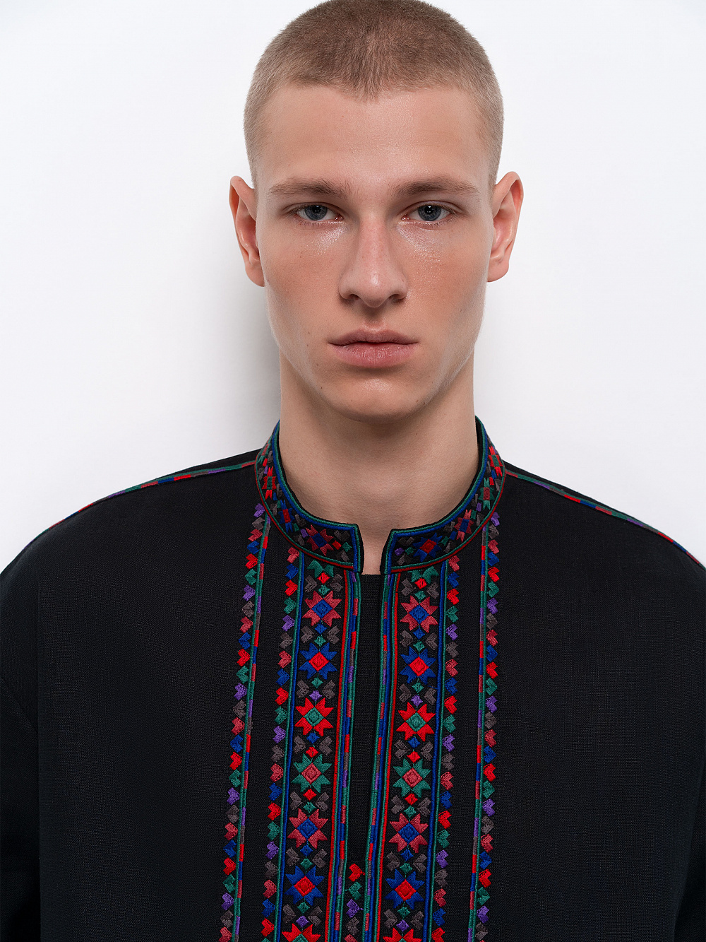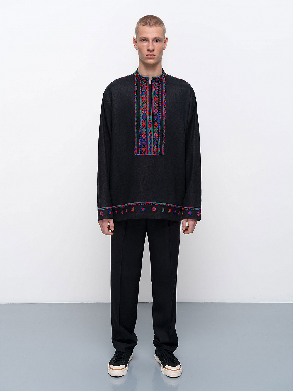 Чоловіча сорочка прямого силуету із застібкою в центрі на кнопку та коміром-стійкою. Натхнена народним обрядом святкування Маланки.