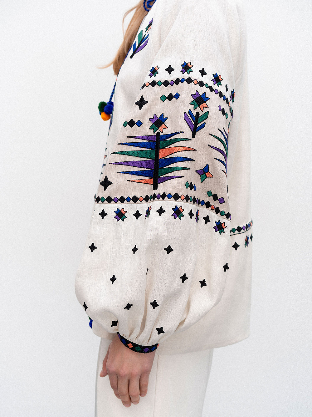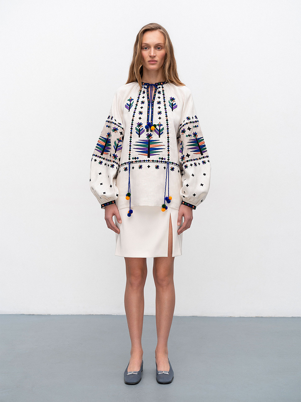 Сорочка Melanka з об’ємними рукавами реглан, зібраними на манжети. На лінії талії — куліска зі шнурами-зав’язками, за допомогою якої можна приталити сорочку. Натхнена українським народним святкуванням Маланки.