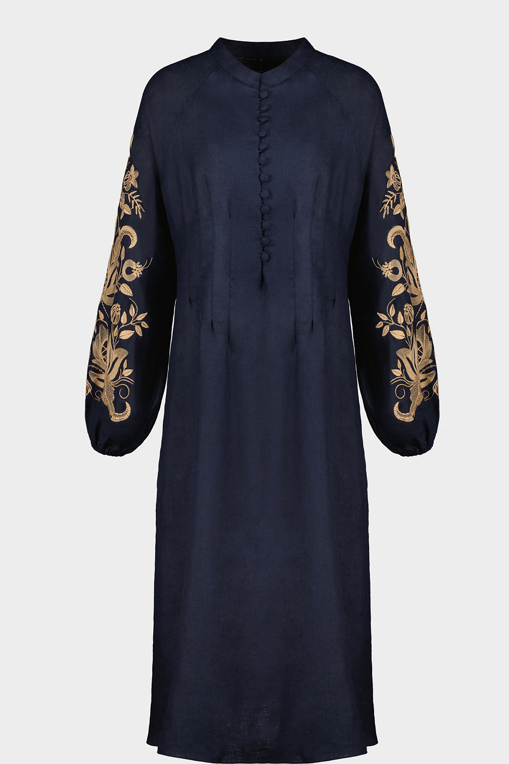 Лляна сукня від Gaptuvalnya виконана за мотивами української традиційної сорочки. Рукави вбрання прикрашені авторським орнаментом «Гранатова лоза», що здавна є символом достатку та початку нового життя.