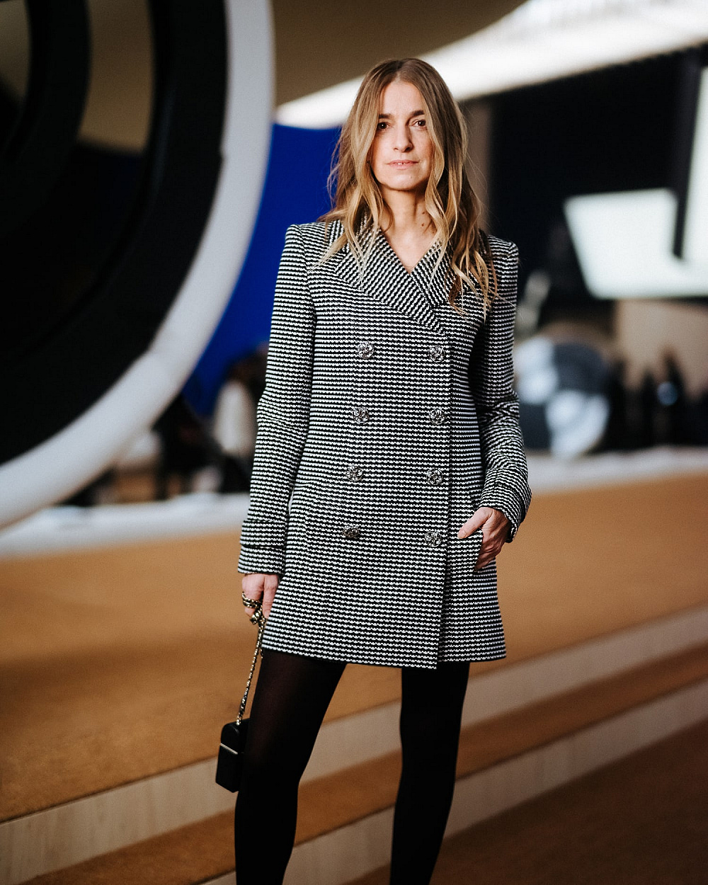 Софія Коппола одягнула твідову сукню в синю смужку та доповнила образ аксесуарами із золота.