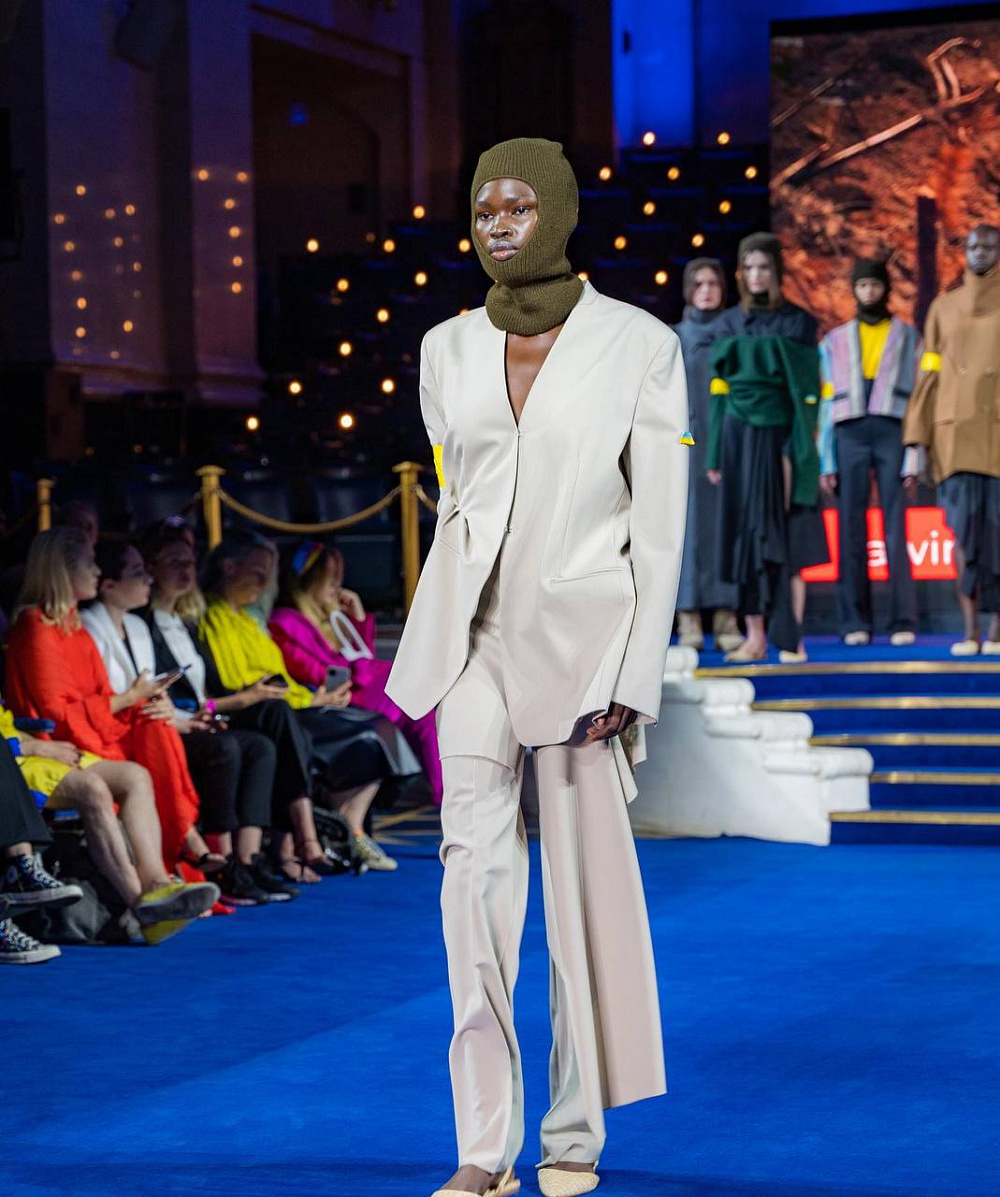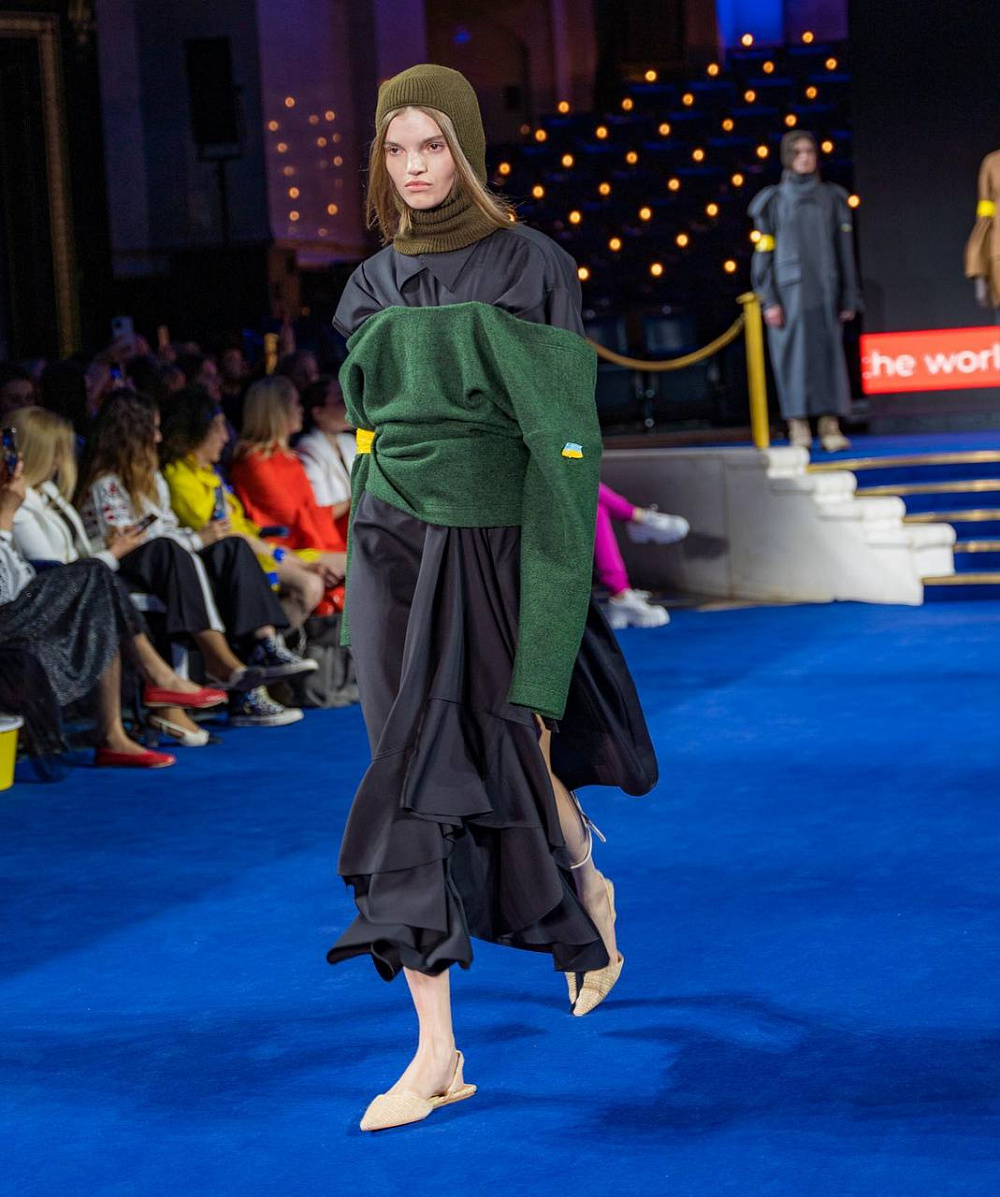 Про це свідчать і військові берці, в яких крокували подіумом моделі, і балаклави, які сприймаються нині скоріше як елемент захисту, аніж як модний зимовий аксесуар. Особливо проникливі елементи – бронежилети, вдягнуті поверх пальто, спеціальні жовті пов`язки на рукавах (саме такі носять українські захисники із лав територіальної оборони), а також жовто-блакитні нашивки у вигляді українського прапора, які мама дизайнерки зв`язала власноруч.