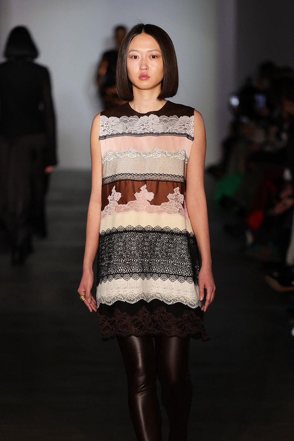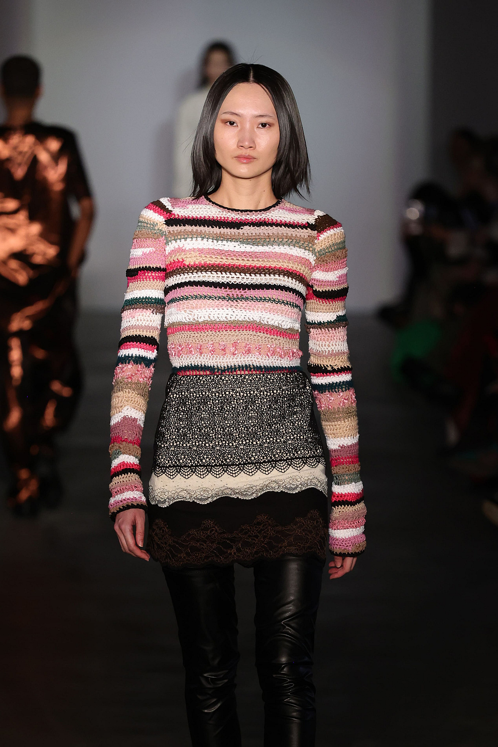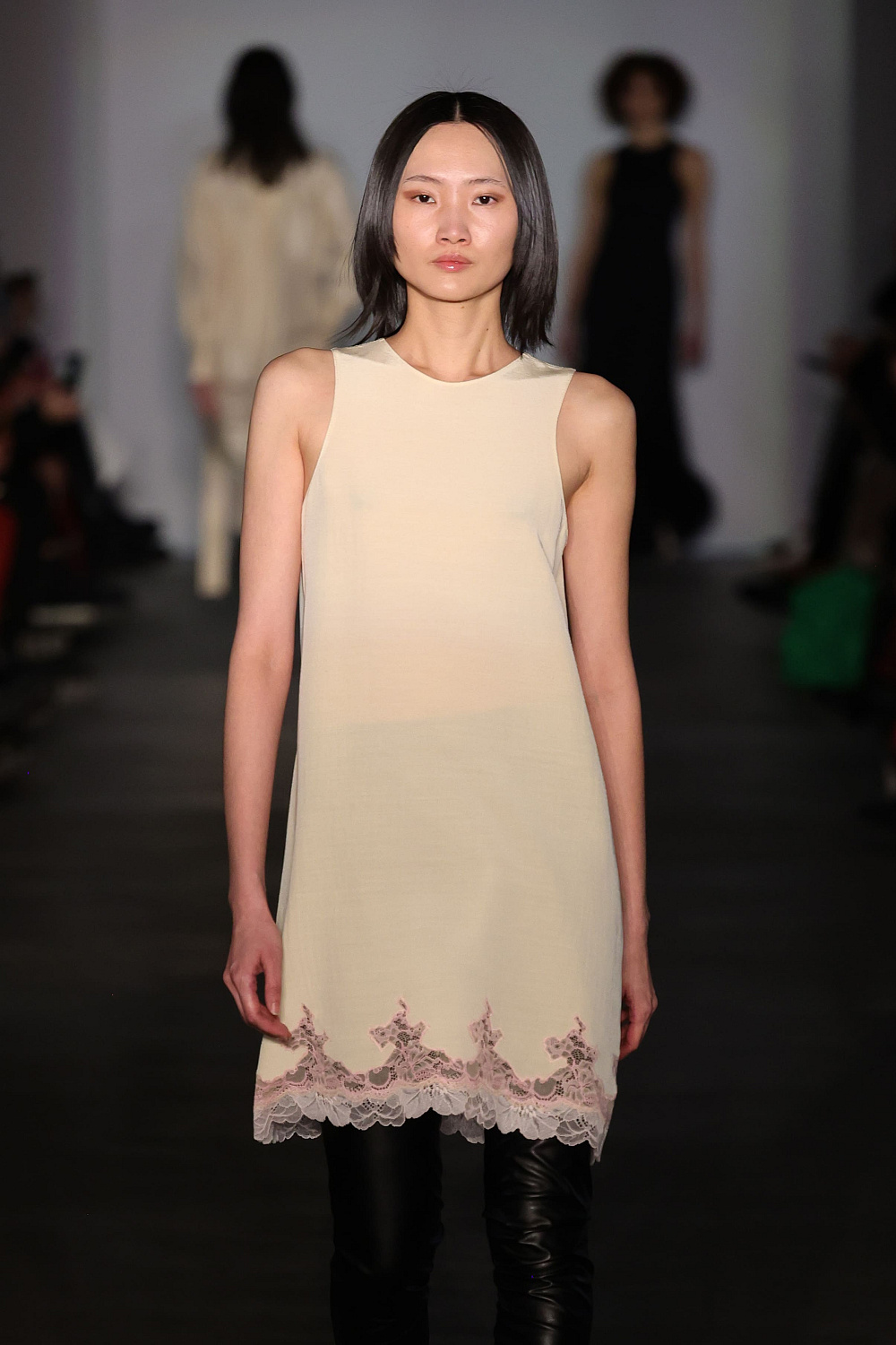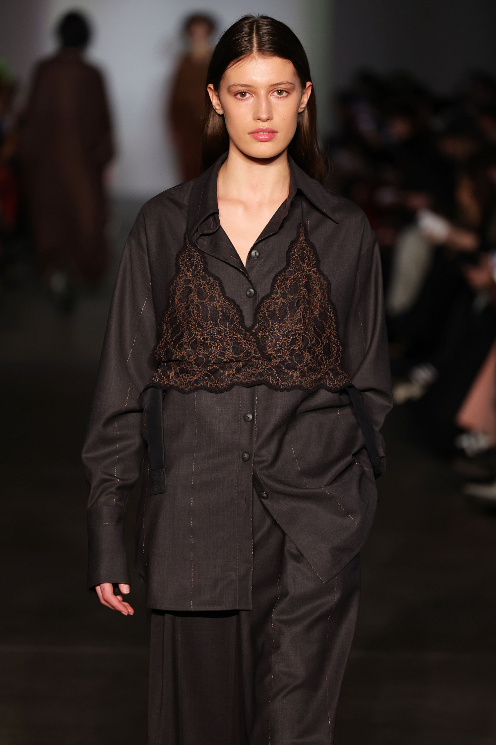 Чуттєвість мережива — один із головних акцентів. Воно надає делікатності фірмовим мінімалістичним фасонам BOBKOVA, від довгих сліпдресів з мереживними краями в стилі 90-х та бра, які вдягаються поверх сорочок, до мінісуконь і спідниць А-силуету в стилі печворк, поєднаних зі шкіряними черевиками-панчохами у стилі Франсуази Арді епохи 60-х років.
