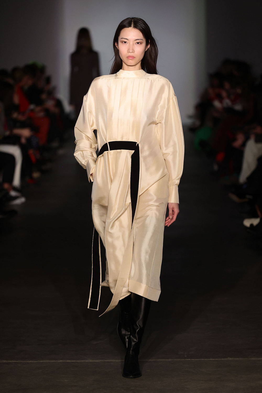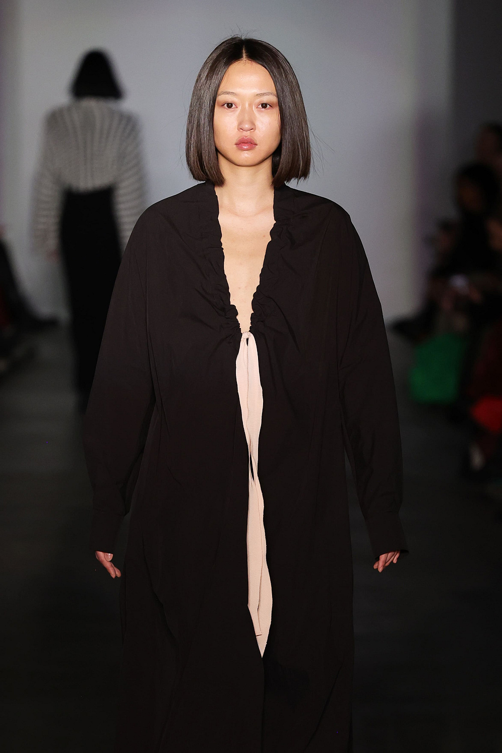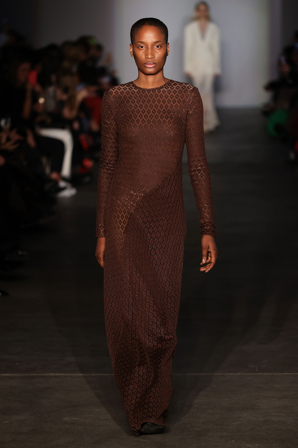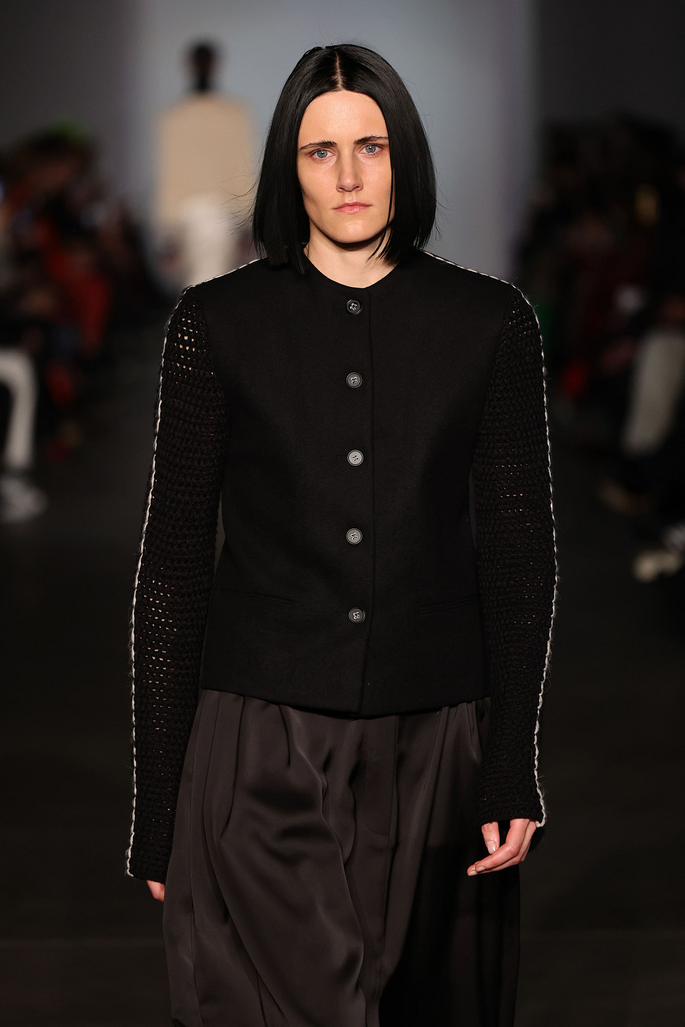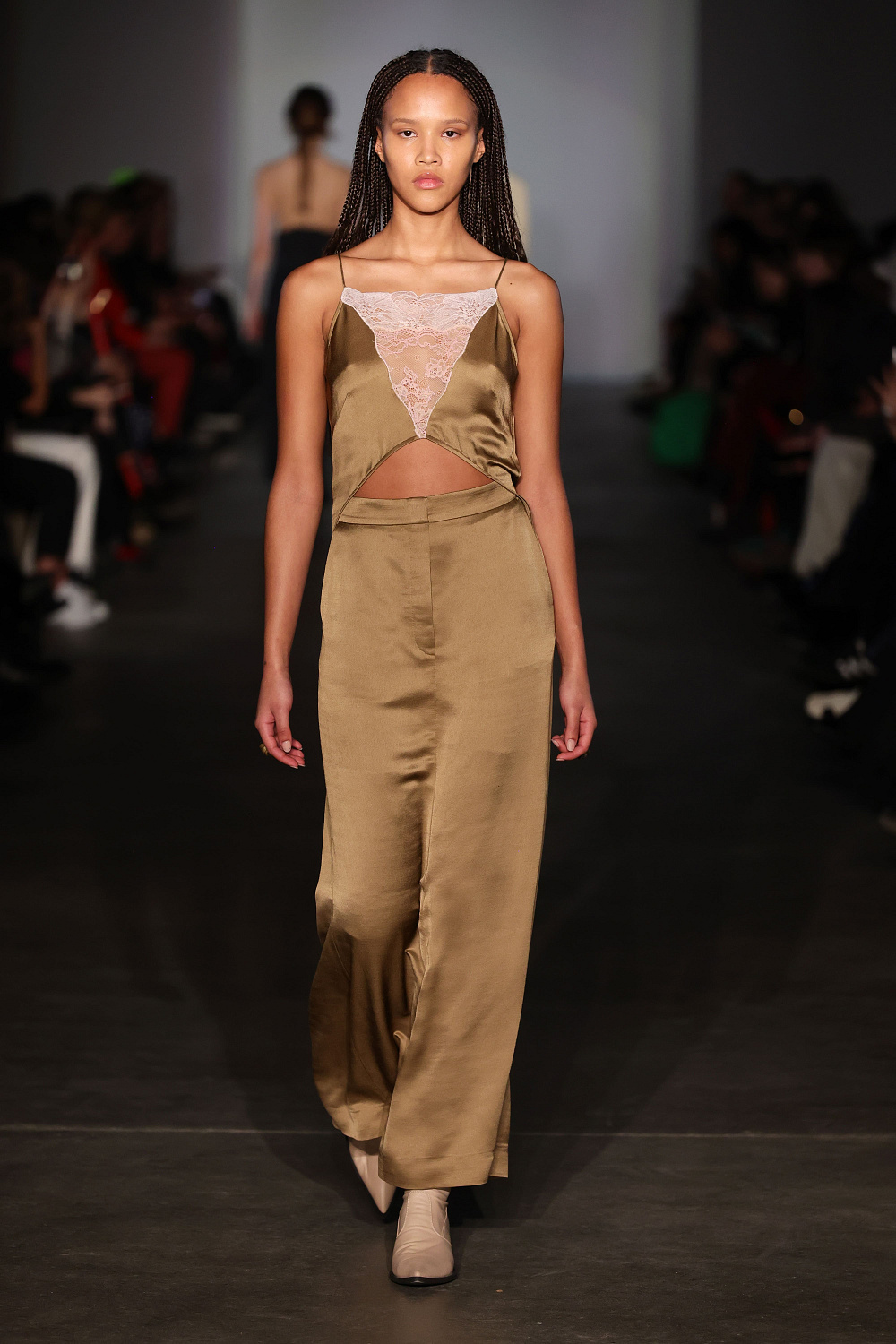 Чуттєвість мережива — один із головних акцентів. Воно надає делікатності фірмовим мінімалістичним фасонам BOBKOVA, від довгих сліпдресів з мереживними краями в стилі 90-х та бра, які вдягаються поверх сорочок, до мінісуконь і спідниць А-силуету в стилі печворк, поєднаних зі шкіряними черевиками-панчохами у стилі Франсуази Арді епохи 60-х років.