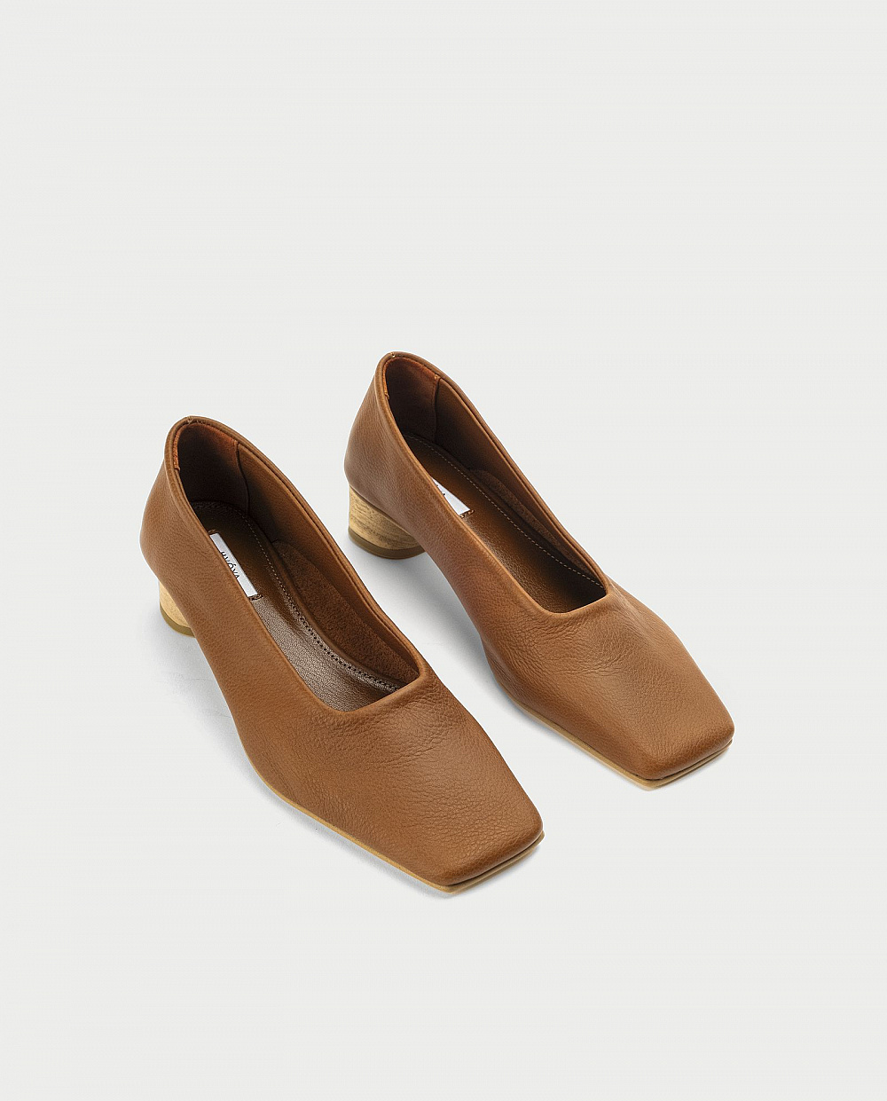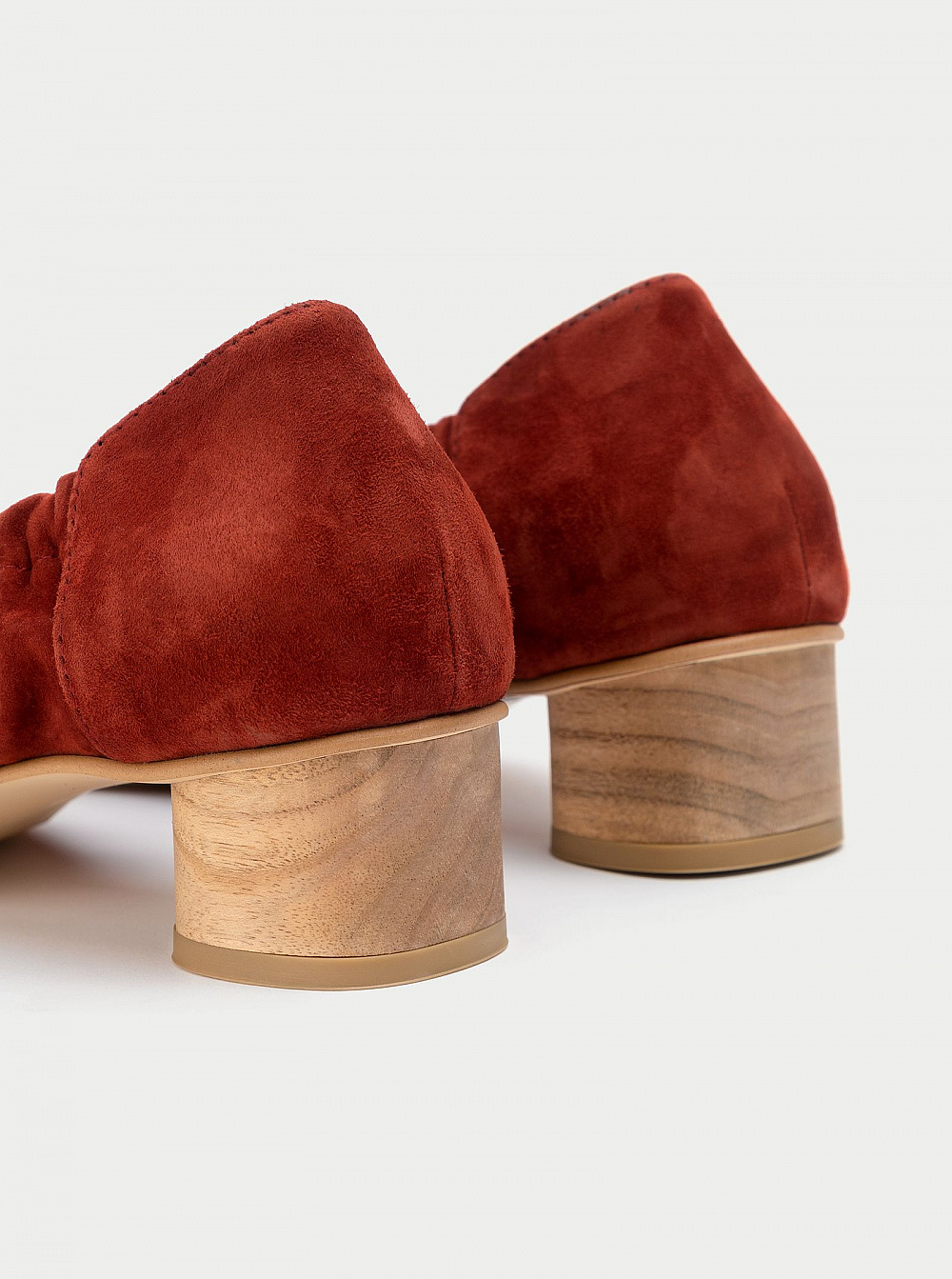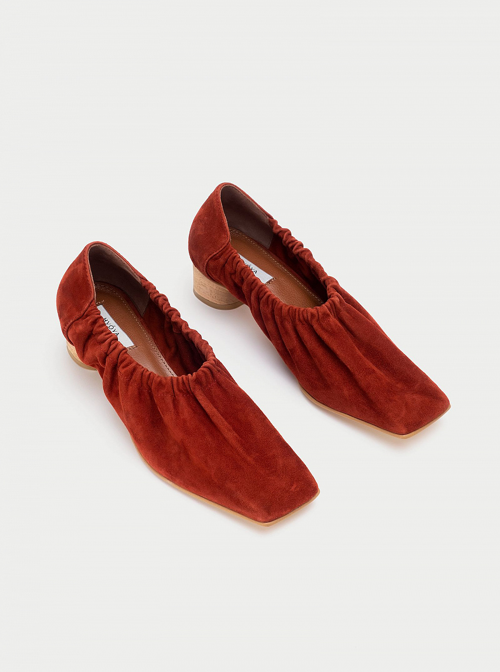 Мінімалістичні туфлі з м’якої шкіри та туфлі із замші в новому теракотовому кольорі з декоративними складками. Підбори на обох моделях виготовлені майстром-столяром вручну з горіхового дерева, тому кожна пара має свій неповторний малюнок деревини.