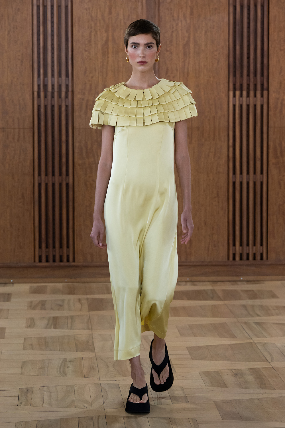Наприклад, традиційна різьблена шестипелюсткова розетка-оберіг (в Україні її називають «громовик») була переосмислена і прикрашає вирізи на спині суконь і топів. Силуети фасонів також повторюють об`єми та форми архітектури: живі й легкі тканини уособлюють зв`язок із цими неймовірними спорудами через широкі, трапецієподібні та східчасті конструкції. Особливий акцент у цій колекції зроблено на кольорах, що відображають як природні елементи карпатської архітектури (дерево, солому та глину), так і кольори регіональних орнаментів і прикрас.