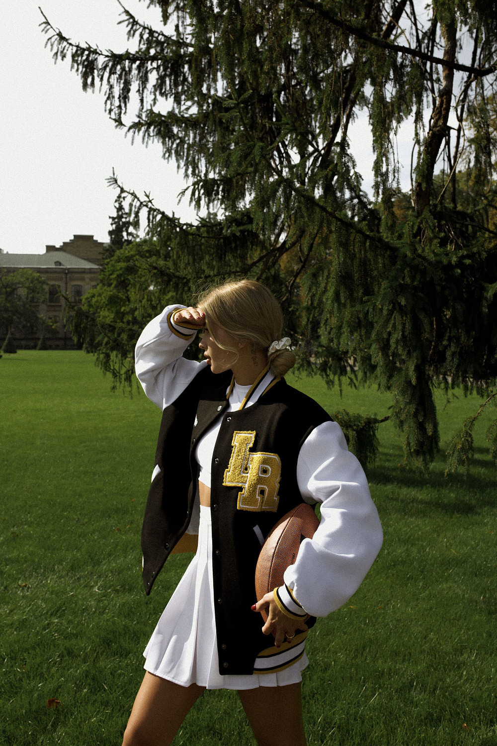 Бомбер в американському стилі сміливо можна поєднувати практично з будь-яким одягом. Це класичне поєднання. Для створення повсякденного образу міксуйте його зі спідницею будь-якої довжини (а краще тенісною, що залишила корт заради модних подіумів) або джинсами вільного крою і білою майкою або топом. А взуття в поєднанні зі шкарпетками — тренд, який викликав велику кількість запитань. Мабуть, найбільше відповідають таким поєднанням лофери — з ними і радимо носити білі шкарпетки.