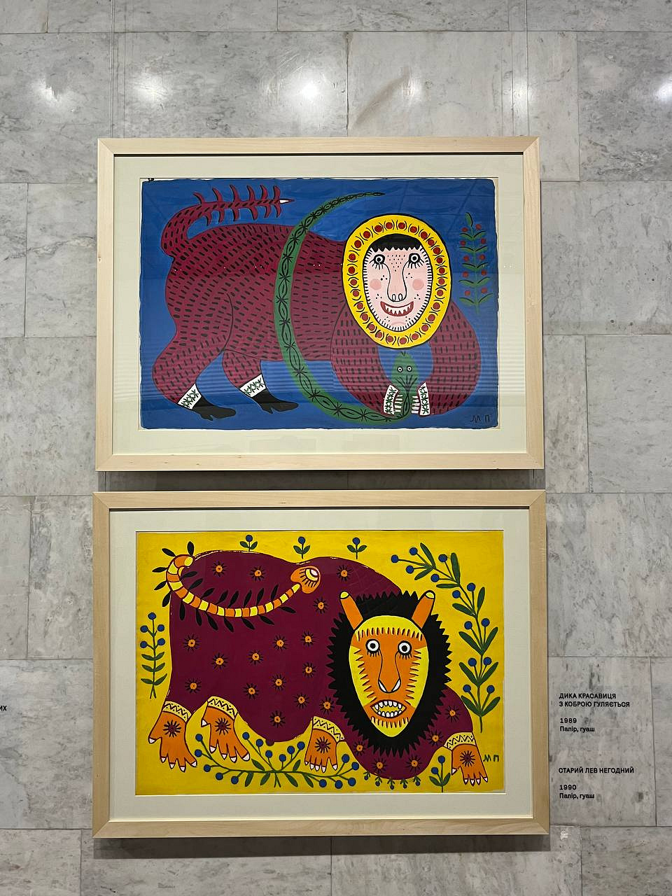 Велику частину експозиції становлять роботи, що стали реакцією художниці на пережите: війну, загибель коханого на фронті, окупацію, бої за Київщину та післявоєнні злидні, Чорнобильську трагедію. Поруч зі знайомими нам образами фантастичних істот і квіткових декоративних панно у картинах акцентується тема боротьби добра і зла, в якій добро незмінно перемагає. Представлені на виставці картини легендарної українки з приватної колекції київського мистецтвознавця Едуарда Димшица раніше ніколи не виставлялися. Біжіть дивитися в Український дім.