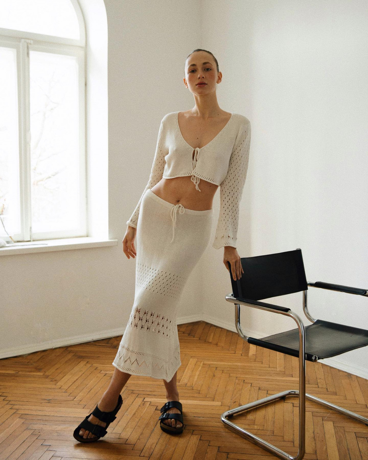 Я закохалася в цей костюм, тільки-но він з’явився на Instagram-сторінці бренду. Мені завжди дуже подобалися в’язані речі для літнього сезону (від купальників до суконь). Як на мене, вони додають цікавої фактури образам. Також неабияку симпатію в мене викликає той факт, що значну частину одягу VISH створюють майстрині, серед яких жінки пенсійного віку та мами у декреті. Таким чином бренд підтримує їх та надає робочі місця.