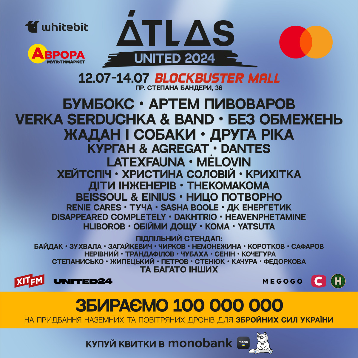 Благодійний ATLAS UNITED 2024 об`єднає тисячі меломанів на території Blockbuster Mall з 12 по 14 липня. На глядачів чекатимуть виступи понад 70 українських артистів: серед яких «Бумбокс», Артем Пивоваров, «Жадан і Собаки», «Без обмежень», Dantes, «Курган & Agregat», «Друга Ріка», Latexfauna, Verka Serduchka з ексклюзивною премʼєрою україномовної програми та інші. Мета фестивалю — зібрати щонайменше 100 мільйонів гривень для підтримки сил оборони.