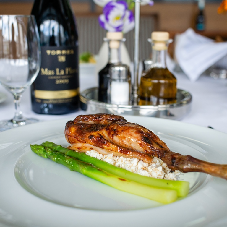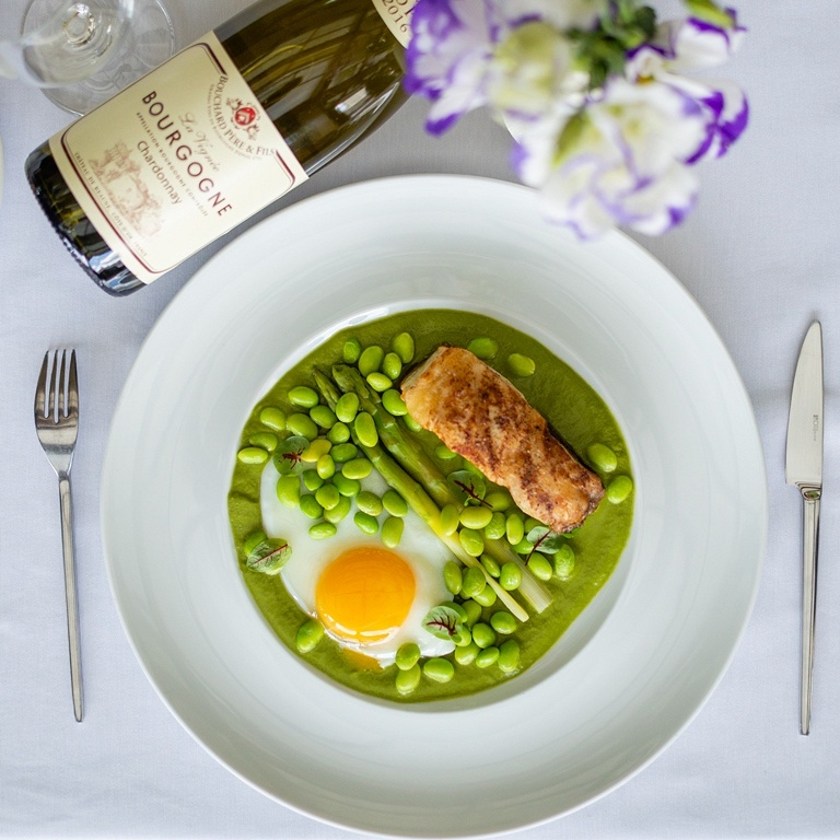 Низкотемпературный цыпленок с копченым творогом и спаржей