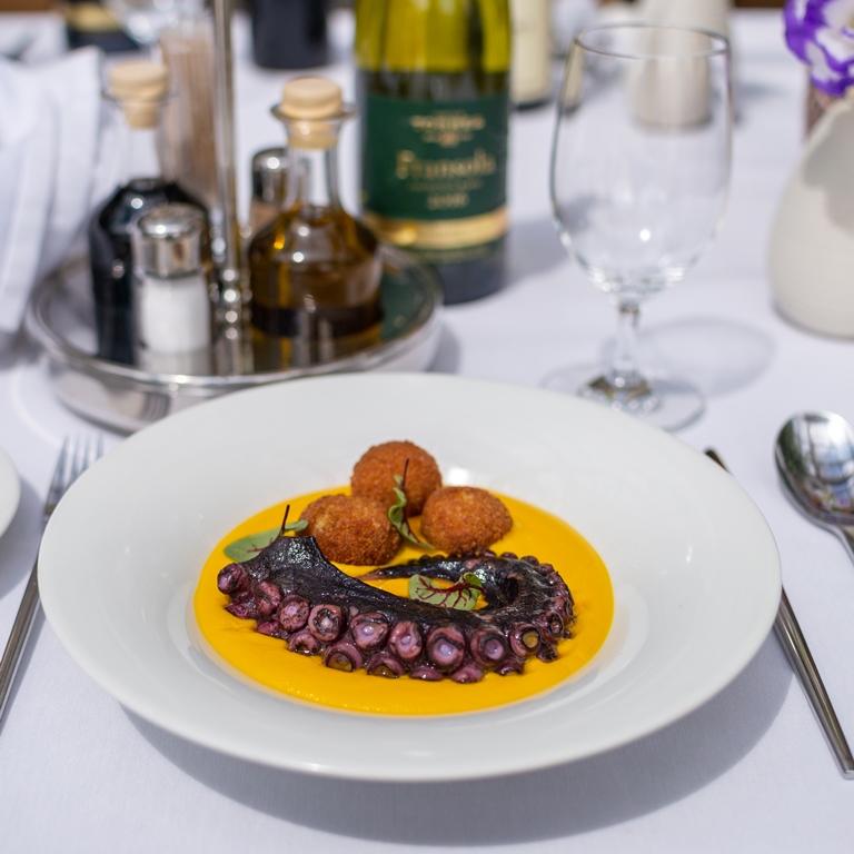 Осминог с морковным кремом и картофельными крокетами с беконом