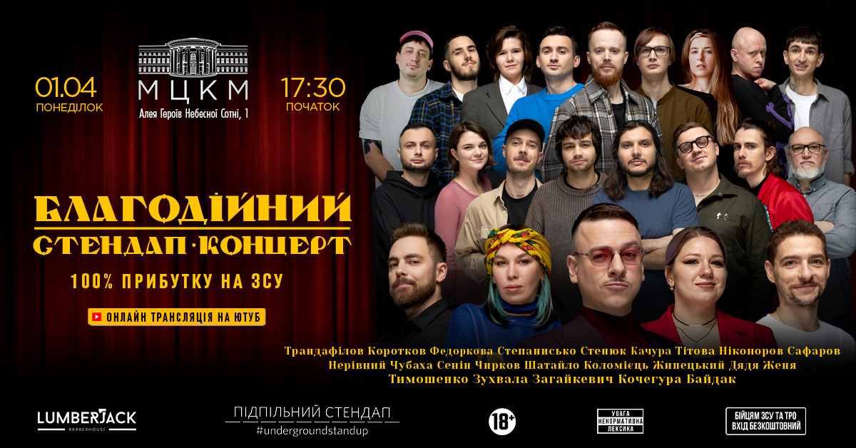 Цього вечора на сцені виступатимуть Свят Загайкевич, Ганна Кочегура, Василь Байдак, Сергій Чирков та Антон Сенін. Коміки не тільки презентують свій матеріал, а й візьмуть участь в імпровізації — вигадуватимуть жарти «тут і зараз» на теми, які напишуть глядачі. 20% із зібраних коштів організатори події надішлють на потреби ЗСУ.
