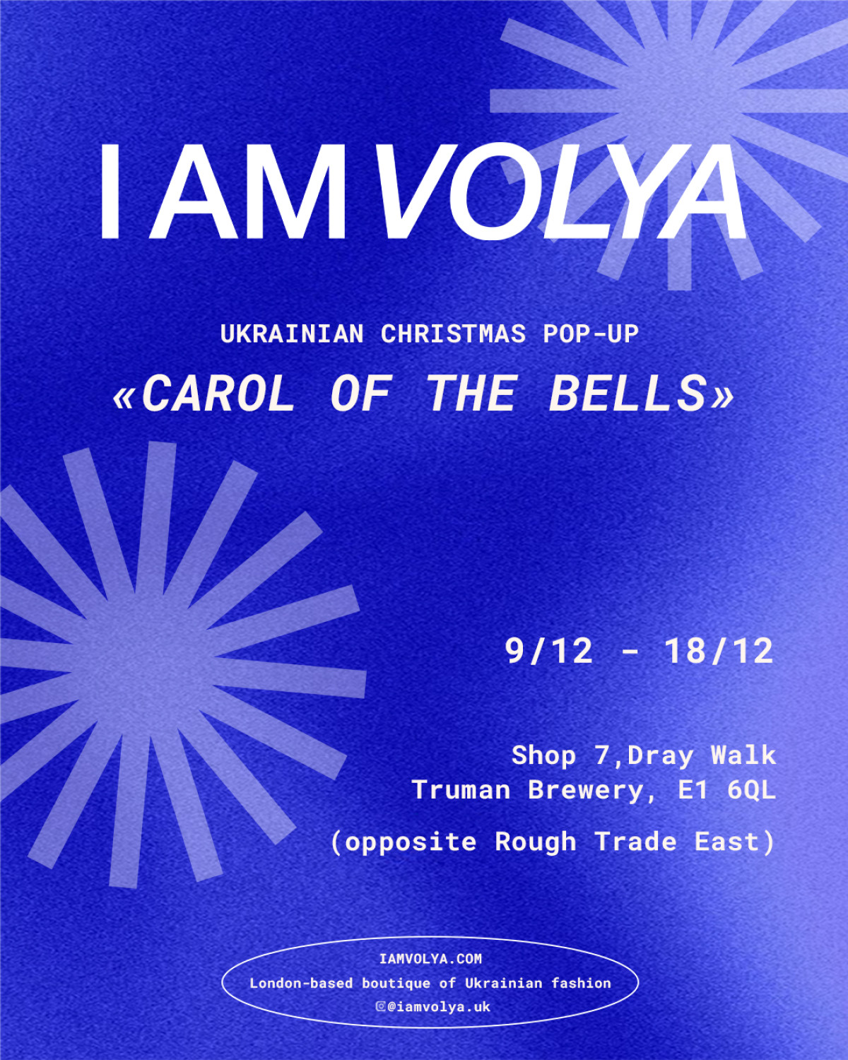 Напередодні Різдва онлайн-бутик українських брендів I AM VOLYA проведе другий поп-ап у Лондоні. Організатори зберуть в одному місці відомі бренди, щоб занурити гостей в різноманітну, багату та неповторну українську культуру. Лейтмотивом поп-апу стала різдвяна пісня «Щедрик», англійською відома як «Carol of the Bells».