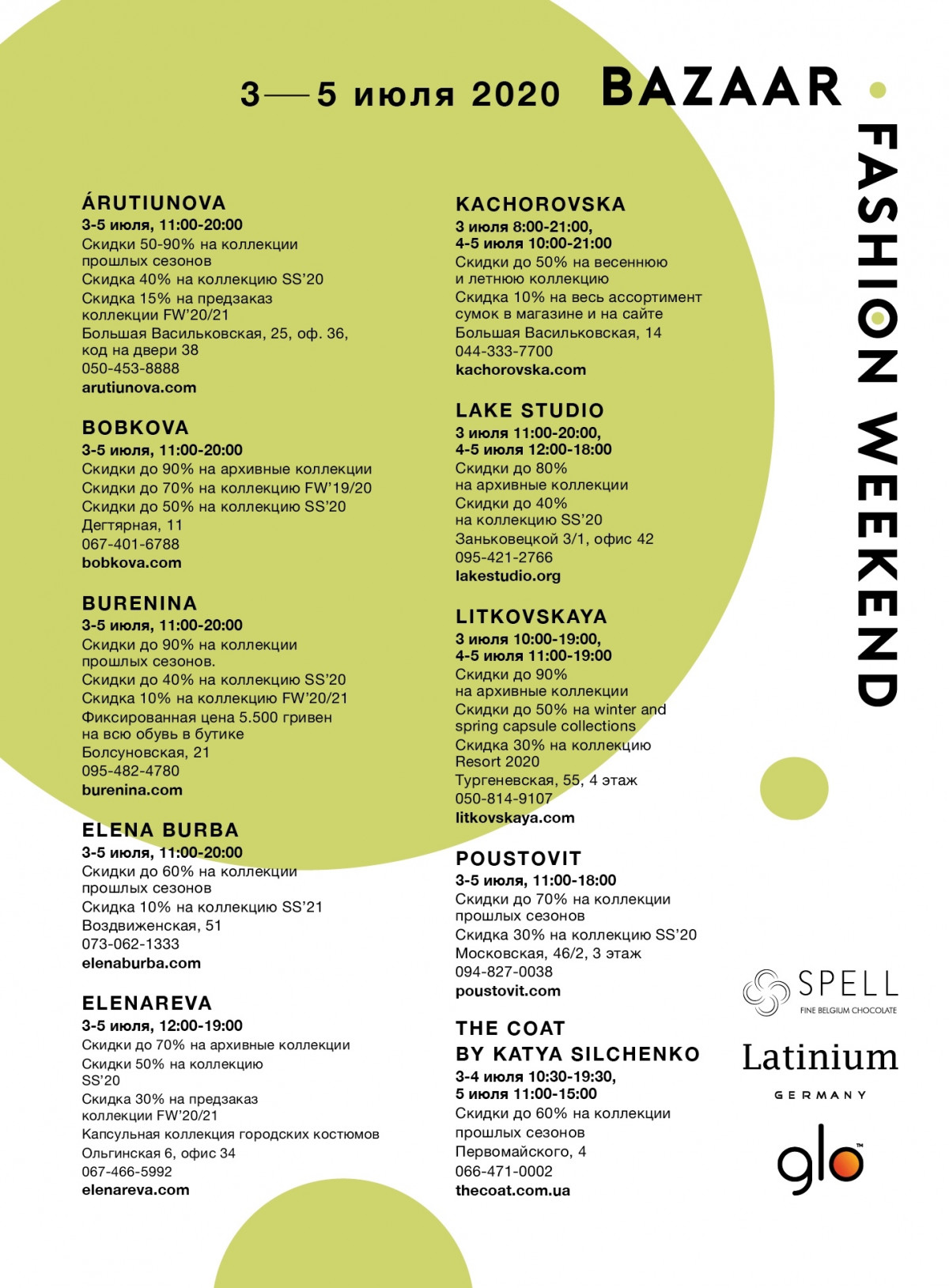 В списке участников Bazaar Fashion Weekend 2020: Arutiunova, Bobkova, Burenina, Elena Burba, ELENAREVA, Kachorovska, Lake Studio, Litkovskaya, Poustovit, The Coat by Katya Silchenko.