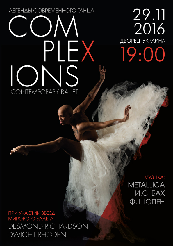 Complexions Contemporary Ballet – всемирно известная contemporary балетная труппа под руководством культовых Дуайта Родена и Дезмонда Ричардсона – звезд современного танца, известных уникальным подходом к современной хореографии. Дезмонд Ричардсон завершил танцевальную карьеру в составе Complexions Contemporary Ballet в 2012, однако в Украине снова выступит в амплуа танцора. Это уникальный шанс увидеть культового артиста на сцене!
