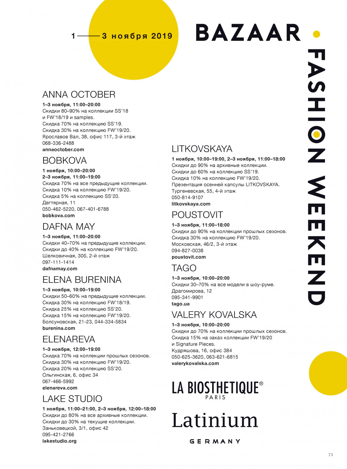 В этом сезоне среди участников Bazaar Fashion Weekend есть как давно полюбившиеся, так и новые имена, а именно — Anna October, Bobkova, Dafna May, Elena Burenina, elenareva, Lake Studio, Litkovskaya, Poustovit, Tago, Valery Kovalska.