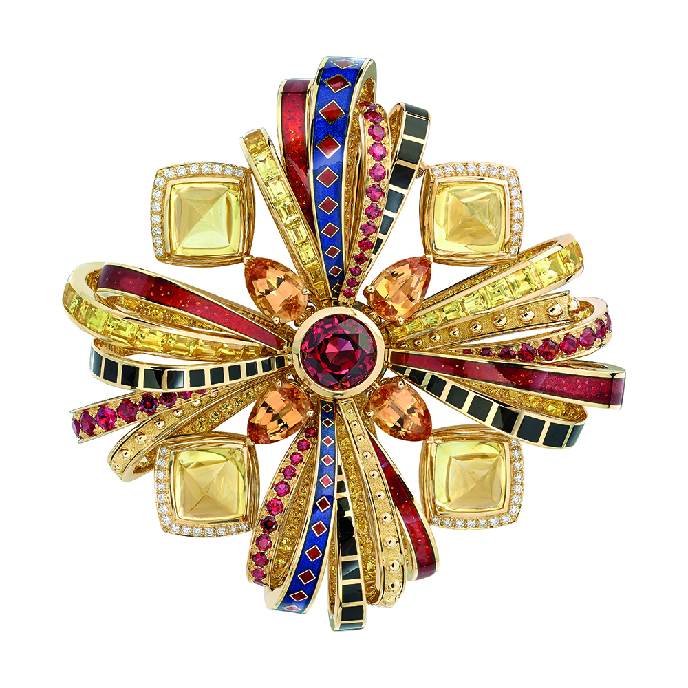 Основательница Дома Chanel Габриэль Шанель была невероятно суеверна — на протяжении всей своей жизни она придавала большое значение талисманам, знакам, кодам. И хотя в новой ювелирной коллекции Дома Les Talismans нет ее излюбленных звезд, цифр и львов, в этот раз дизайнеры также объединили драгоценности символом удачи — четырехлистником. Еще во времена друидов это растение считалось счастливой находкой. Брошь Attirante — ключевое украшение коллекции. Его дизайн напоминает награды, которыми в свое время отмечали за доблесть французских аристократов. В центре броши из желтого золота сияет ярко-красная шпинель, а вокруг — настоящая феерия из россыпи желтых сапфиров, оранжевых топазов и белых бриллиантов.