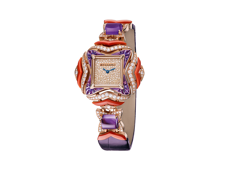 Коллекция высокого ювелирного искусства Дома Bulgari под названием Italian Gardens — это сто уникальных украшений, среди которых не только серьги, колье и браслеты, но также четыре оригинальные модели часов. Ювелирная геометрия времени в точности отображает гармонию солнечного света и вечнозеленых растений из знаменитых итальянских садов, возникших еще в эпоху Возрождения. Одну из моделей часов украшают мягкие линии теплого коралла и холодный аметист. Их контраст разбавлен белыми бриллиантами, подчеркивающими глубину и объем драгоценных камней. Фиолетовый ремешок из кожи аллигатора украшен золотой пряжкой с двадцатью бриллиантами.
