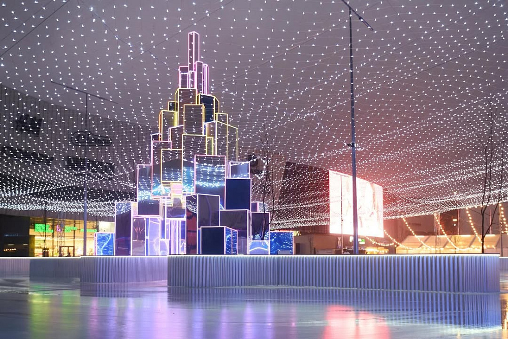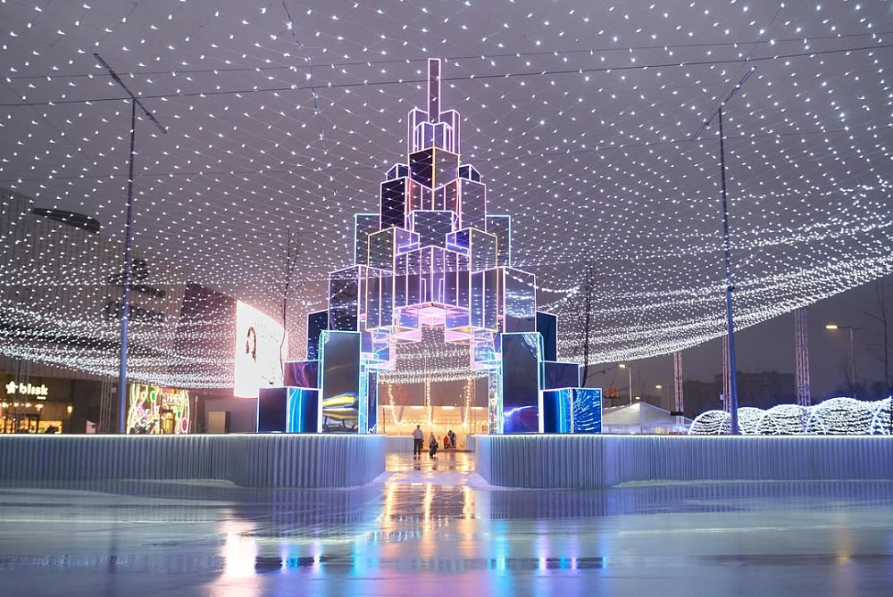 Прямо на набережній біля ТРЦ River Mall розмістилася ковзанка, що нагадує казкове замерзле озеро. В її центрі — не звичайна ялинка, які ми звикли бачити на льодових майданчиках, а велика композиція у вигляді кристала, прикрашеного візерунками й ліхтариками, що лише доповнює атмосферу.
