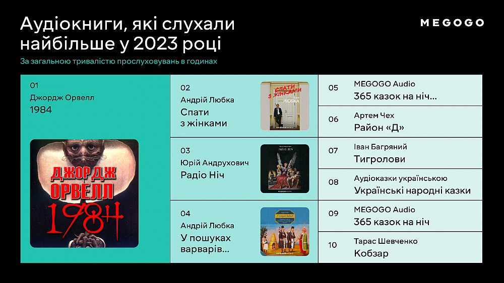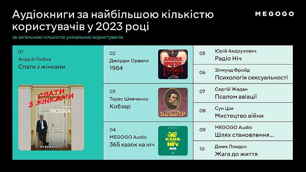 Серед аудіокниг за кількістю унікальних користувачів лідирувала збірка Андрія Любки «Спати з жінками», а за тривалістю прослуховування — антиутопія Джорджа Орвелла «1984».