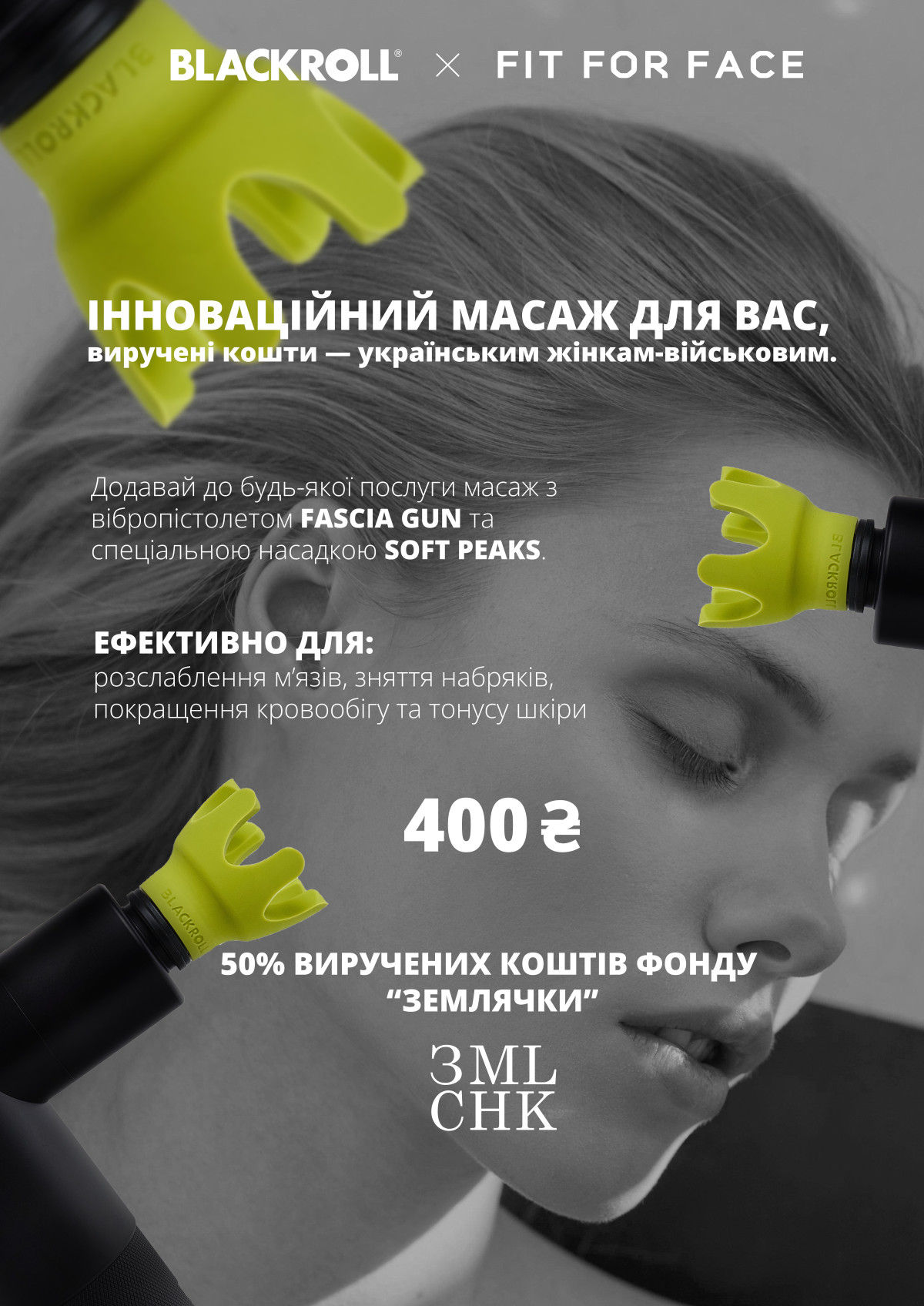 Краса — це не тільки про зовнішність, а й про вчинки. Тому FIT FOR FACE та BLACKROLL об`єднались, щоб цього місяця підтримати фонд «Землячки». З 15 по 31 березня додавайте до будь-якого масажу в салонах масаж вібромасажером BLACKROLL® FASCIA GUN та м`якою силіконовою насадкою SOFT PEAKS, щоб отримати: