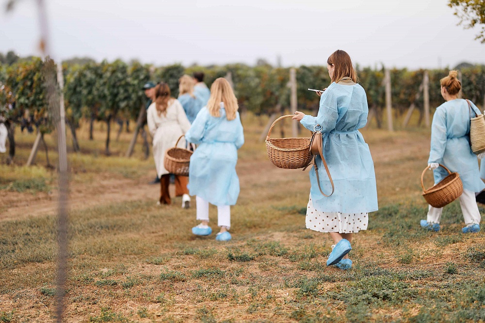 Столь трепетное отношение передалось и нам. Мы убедились в этом, когда, надев специальную одежду, вооружившись корзинками, отправились срезать сорт каберне-совиньон.