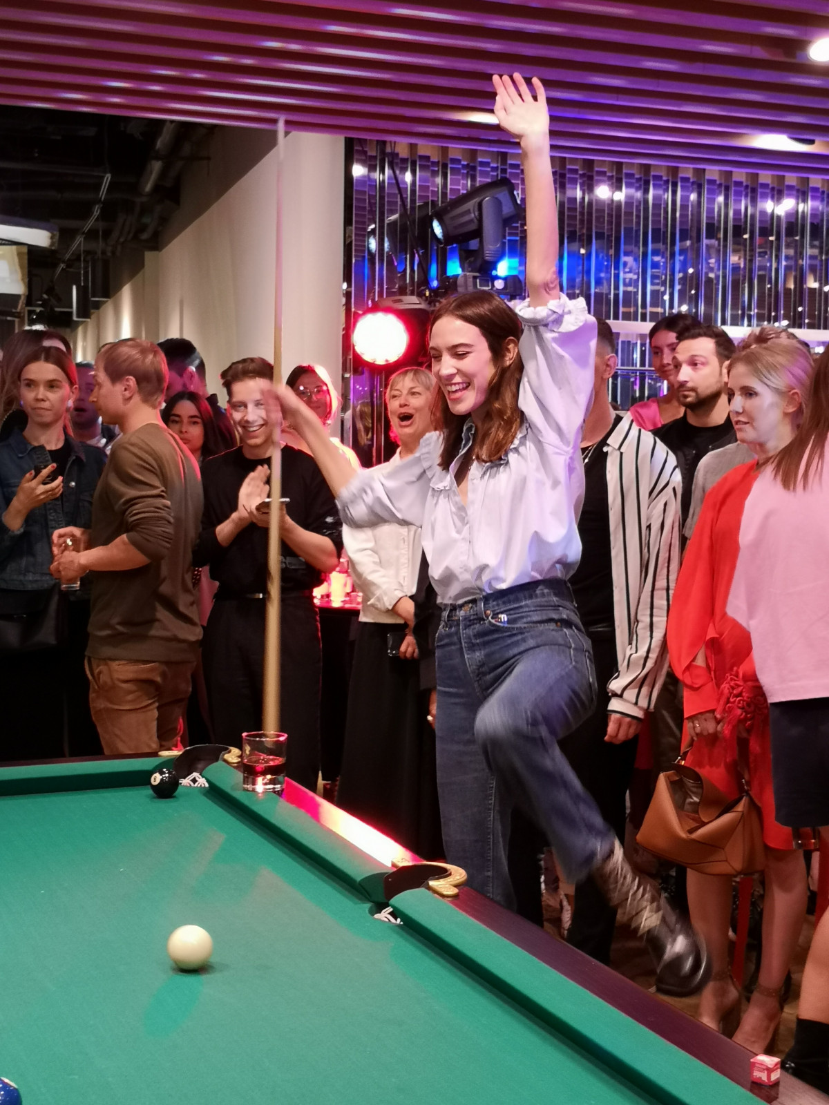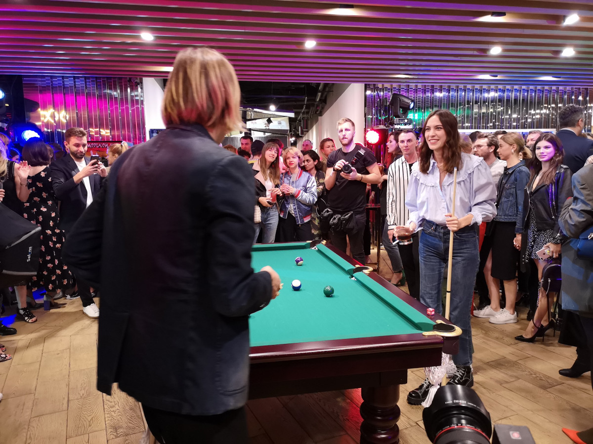 После нескольких блиц-интервью и зажигательного DJ-сета Алекса решила сыграть партию в бильярд с Женей Примаченко. Толпа обступила стол плотным кольцом и разглядеть, кто же ведет счет, было практически невозможно.