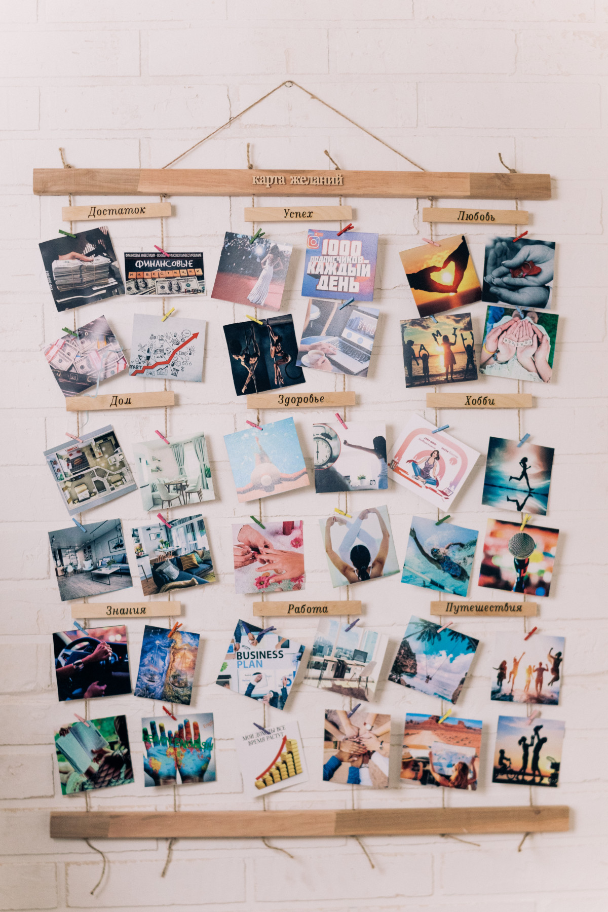 1. Готовый набор для создания Карты Желаний: рамка из натурального дерева, набор цветных картинок, декоративные прищепки, стикеры для исполненных желаний.
