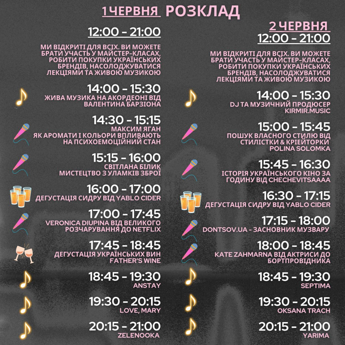 На івенті можна буде побачити українські бренди, яких не знайти на полицях магазинів, взяти участь у благодійному аукціоні на підтримку ЗСУ, відвідати лекції на нетипові теми, наприклад, як почати співпрацю з Netflix, продегустувати найкращі вина від Father’s Wine і сидр Yablo та інше. Також будуть виступи українських інді-гуртів та виконавців, зокрема ANSTAY, Love, Mary, Zelenooka, Septima, Yarima, Dj Solpec. Вартість вхідного квитка: одноденний — 550 грн; дводенний — 800 грн. Більше інформації про захід шукайте на Instagram-сторінці.