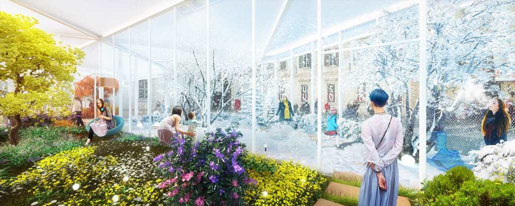 В едином пространстве площадью 500 кв.м, спроектированном с применением энергосберегающих технологий будут представлены четыре природных и климатических микрокосма, которые позволят четырем временам года сосуществовать одновременно. Посетители окажутся в природной среде и испытают на себе смену четырех сезонов: Зимы, Весны, Лета и Осени, дополненных впечатлениями о доме и семье.